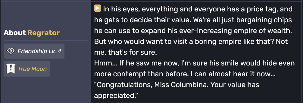 >>563757357>hates China>extremely mercantile>hates China>tried to fuck over Liyue>playable characters say he's a piece of shit>hates ChinaPantalone was fucked the moment he was mentioned in Yelan's story quest. Just look at this, Columbina makes him sound worse than even Pierro.>>563757612Narration Footnotes has always been about the Detective aka Pierro, the rest are just tools.