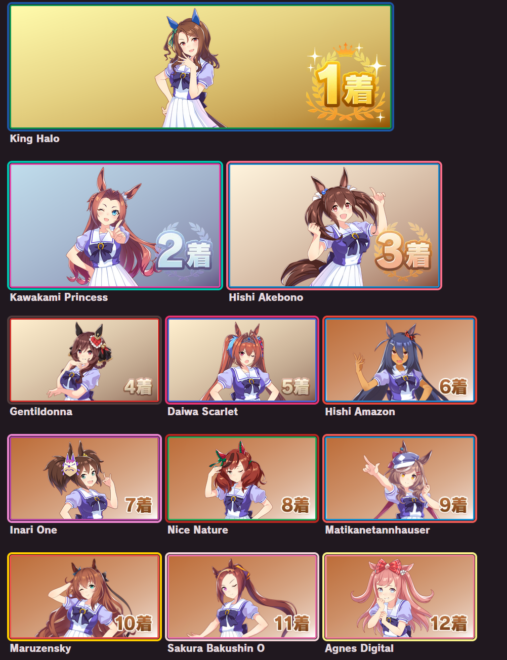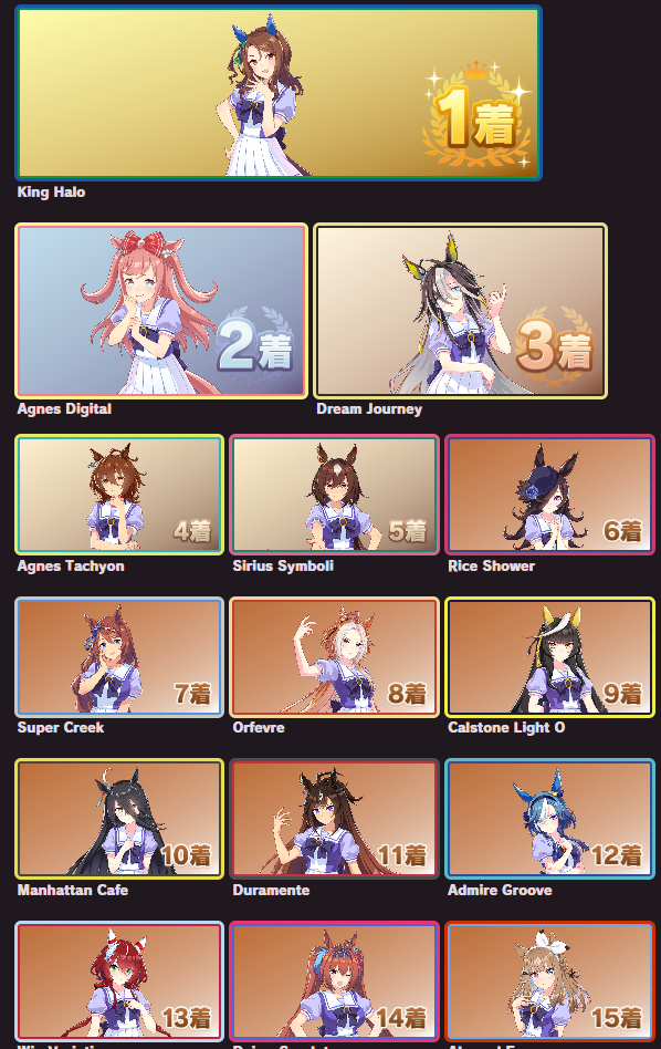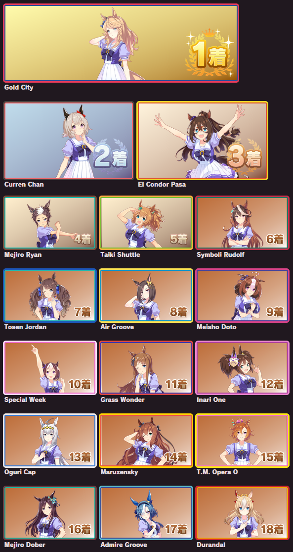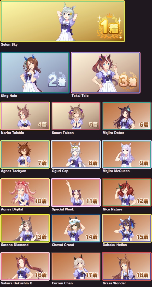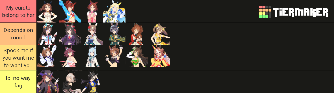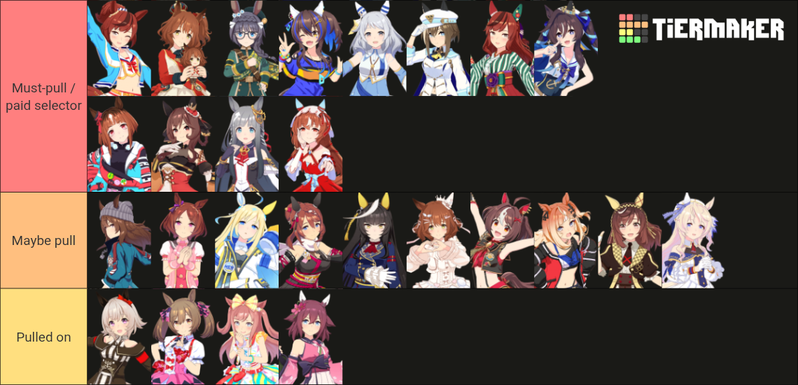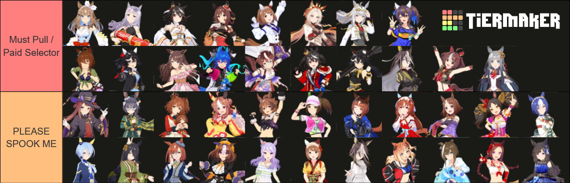 >>563768736I posted mine last thread, but here's the full listhttps://snep.pw/uma/sorter/result/G7pY8Rz1xvG1AmjyVcRL