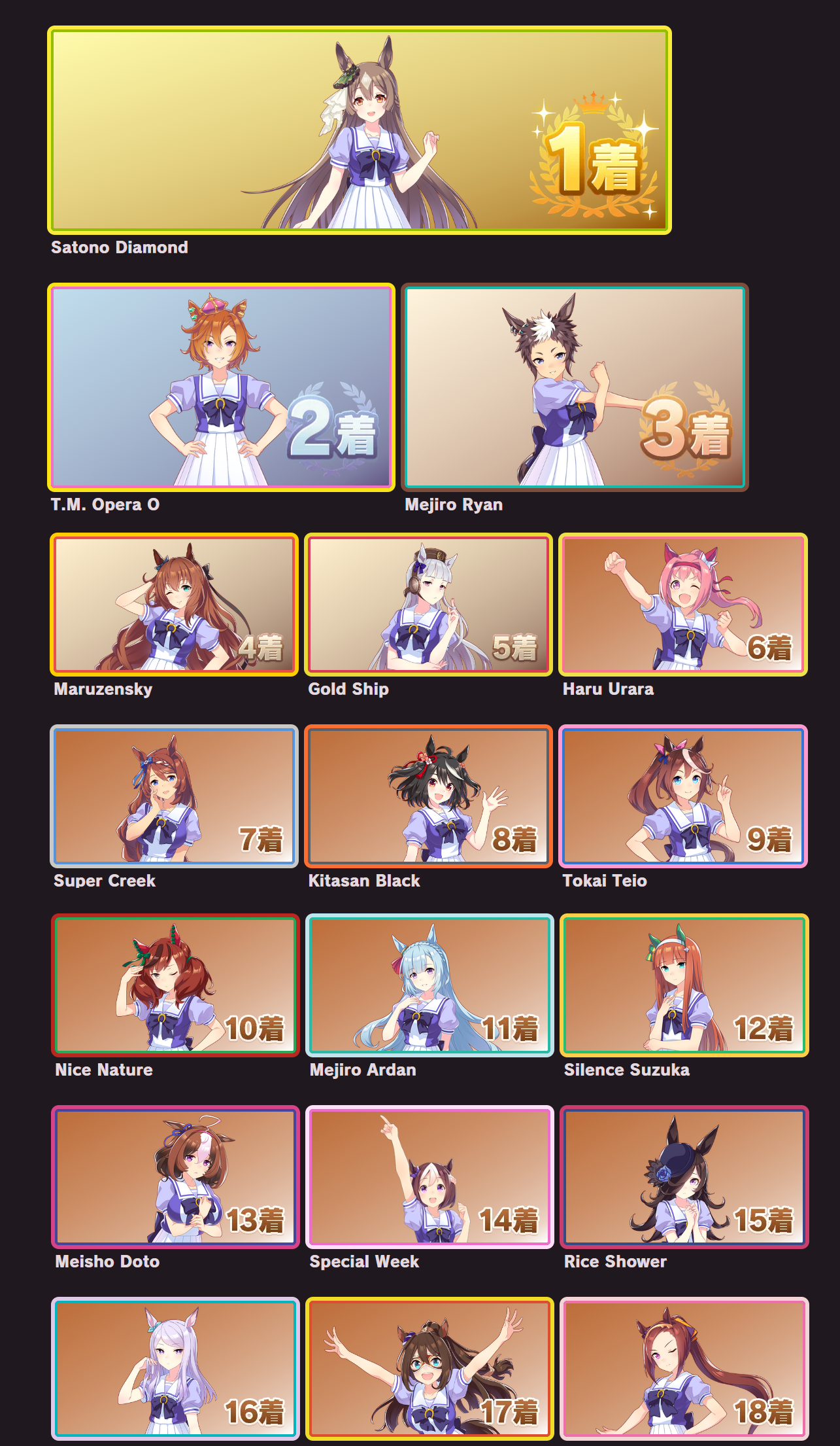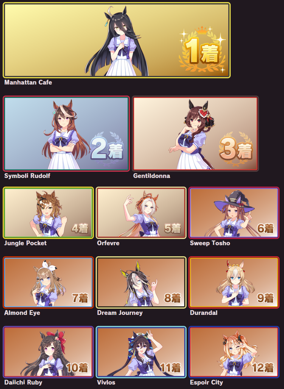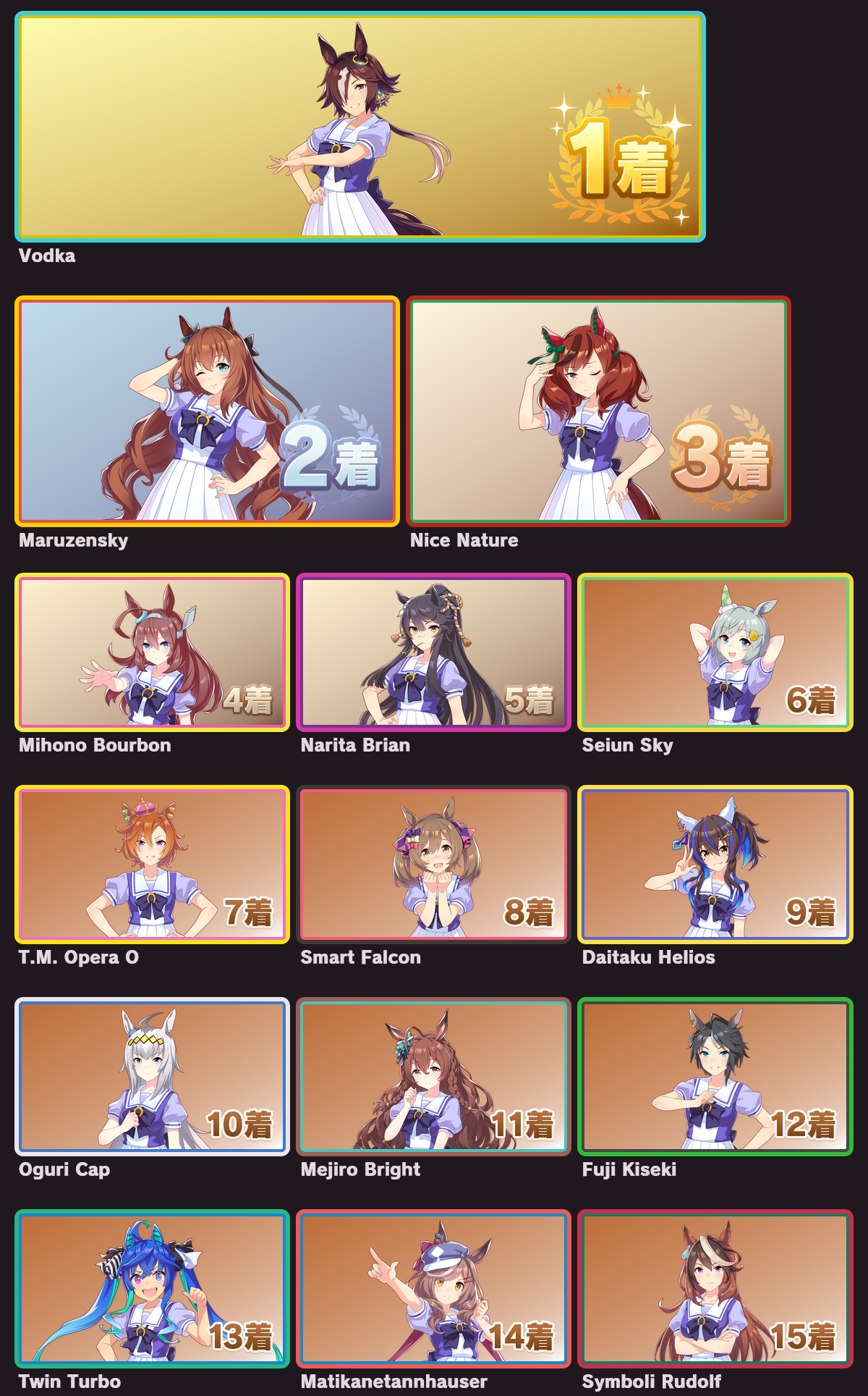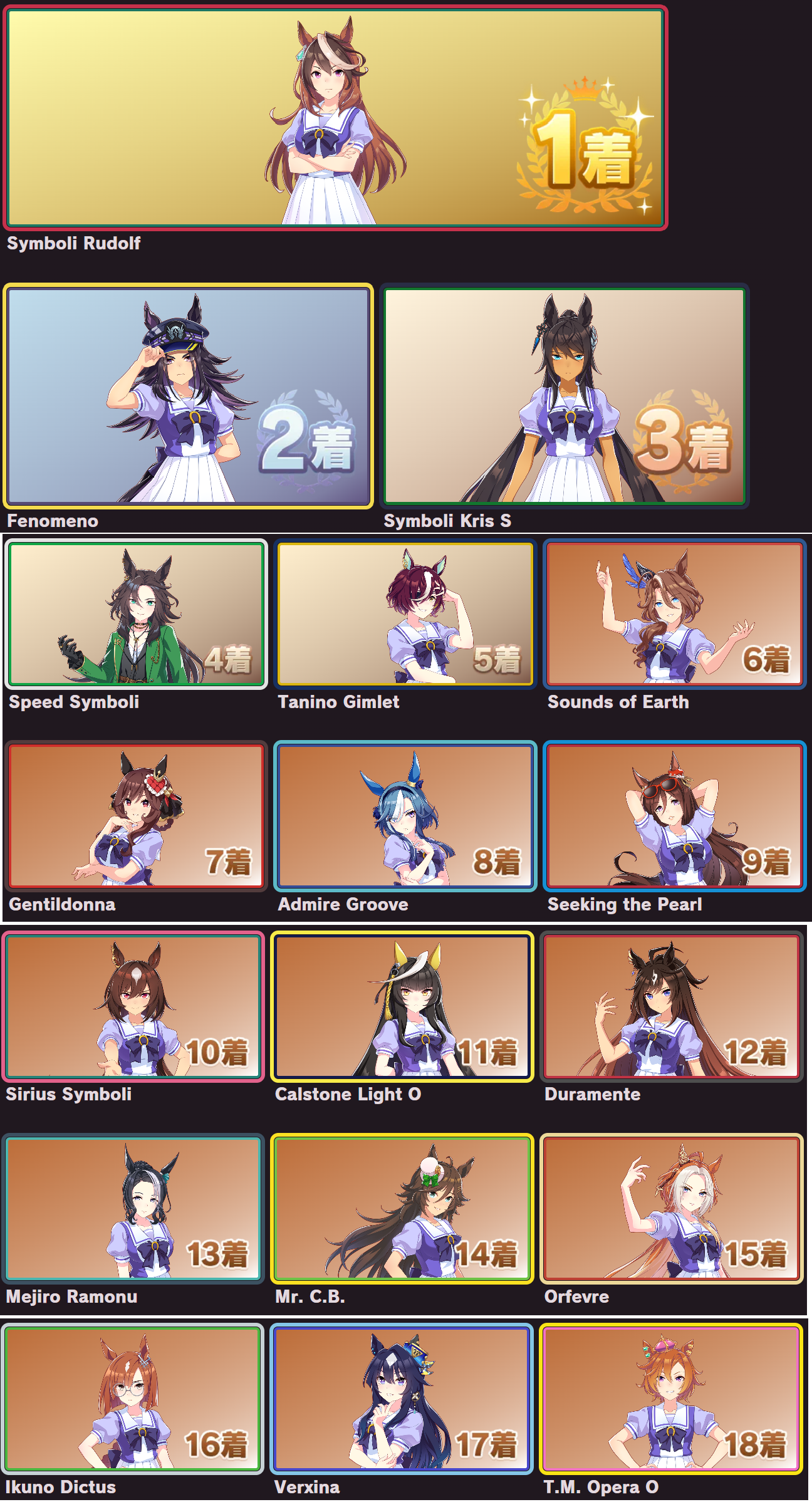 >>563768736I posted mine last thread, but here's the full listhttps://snep.pw/uma/sorter/result/G7pY8Rz1xvG1AmjyVcRL