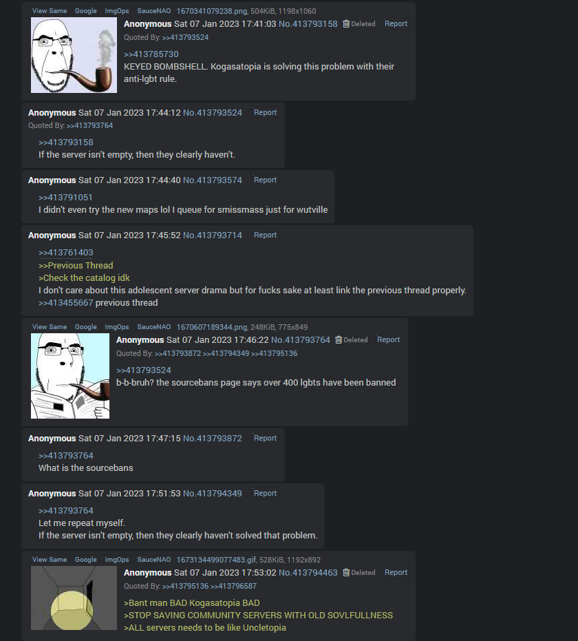 >>563771394>Why does this matter?The section is for 4chan servers, not "servers I like." It's literally not a 4chan server. You will literally get banned if they find out you're from 4chan. Advocating for its inclusion is like advocating for scrap.tf to be in the OP, only a retarded newfag would think this and it's laughable.>if things for some reason devolve into that again it's as simple as taking the server off from the OP.It's better to just never reach that point to begin with. Everything that comes out of Kogas is drama related. If you want to play on Kogas no one will stop you, it just doesn't need to be in the OP for that.