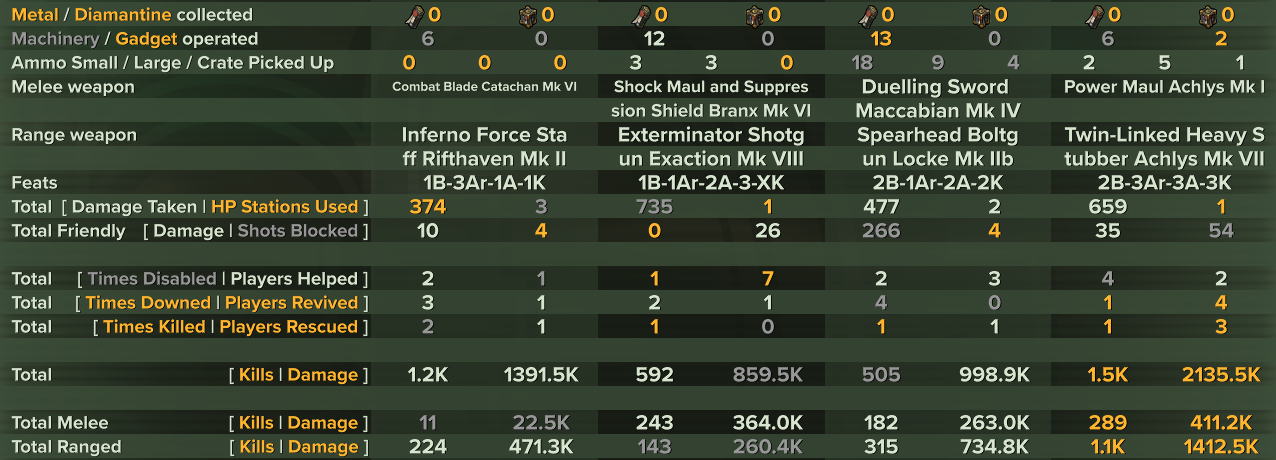 >>563805087From left to right:>2nd most damage dealt, least damage takenArb->most deathsI mean Scum>most damage taken, least damage dealt, most players helpedZealot>friendly fireOgryn I guess?>twice as much damage as everybody elsePsyker. Then again, "most times disabled" is usually the ogryn's shtick so he could be the "gunlugger" (rumbler).