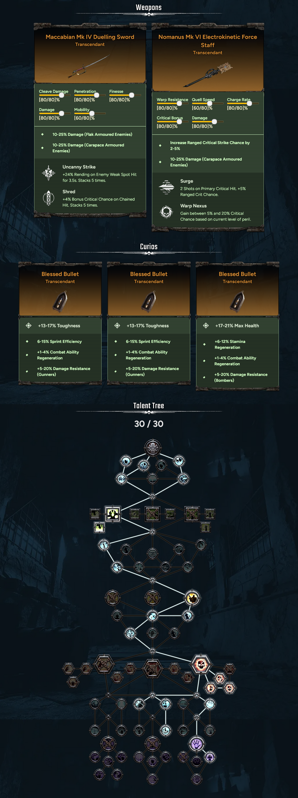 >>563997096Im not sure why its so drastic in difference, but what i can say are two thingsThe base damage of a knife PA to the body is about 151ish damage at maxed weapon stats, so not including any buffs or anything (you can verify this on gameslantern, the range of an unarmored body hit on a heavy sweep is 75 to 175, which would put an 80% roll at around that 151ish range. The push attack for both knives share this exact profile which is why you can check this way despite GL not showing PAs.) Yours is at 190, which tells me that you probably have some damage somewhere you missed. Not only that, but I know you do because there's a 10% melee dmg stay node on the way there that is mandatory pathing, so it'll always be a little less than 20%.The source of how its damage works is from kuli's steam guides which are basically gospel. He reads the code regularly with each patch to update and verify EVERYTHING, he knows the game better than a lot of the devs at this point. Just mentioning my source so you can check yourself rather than just hear me babble