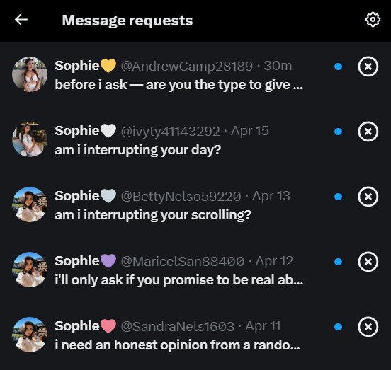 my moonie, whos had 2 of her twitter accounts where all she did was retweet art from others suspended for apparently seeming like a bot, has her last account's dms look like