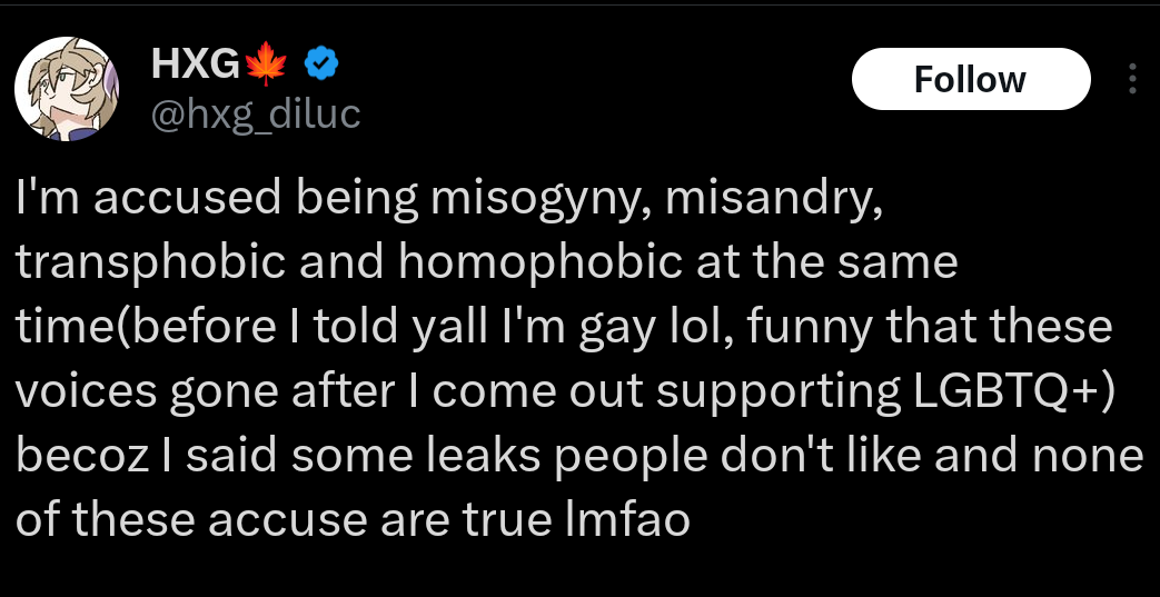 >I'm accused being misogyny, misandry,>funny that these leak voices gone>after I come out>none of these accuse are true Imfao