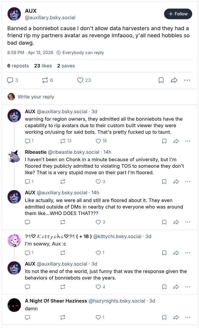 >>563776727>>563683779https://bsky.app/profile/ziitaur.apricotpaws.com/post/3mjnqjb4ef227Looks like two Furries are trying to push a story that the Bonniebots are ripping mesh as they travel around the grid. I wonder if they fed this story to Soft Linden since he hangs out in Chonk sandbox.