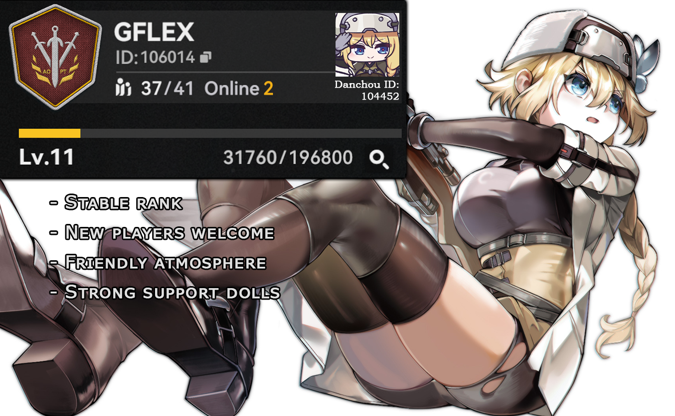 /gflex/ on Dorkwinter is recruiting! /gflex/ is a laid-back platoon with our only goal being to get top 5. We have always been in the top 2% or above and we have a lot of V6 dolls available to use. We are looking for active anons who will do their dailies/hits. If this sounds up your alley then please apply with /gflex/ in your profile! If you have any questions feel free to add me.>Platoon ID: 100945>Danchou UID: 767763
