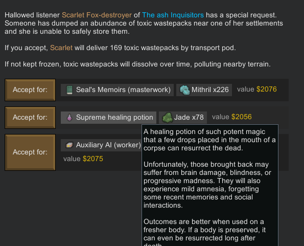 >>563950970One of the other rimworld xml quirks I actually discovered that forcing hediffs like death acidifier also cancels even that 1 random hediff entirely, another bizarre tynan codingbut yeah that was my intent too