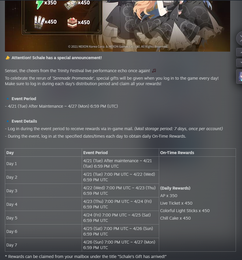 Previous Thread: >>563791694>Guides, Resources and useful links:https://rentry.org/bagguides>/bag/Circles/Clubs/Friends:https://rentry.org/holdingthebag>4koma, Manga, Side Content, PVs & Shortshttps://rentry.org/bacontent>>(JP) – JST>Banners:>4/15 11:00 – 4/21 10:59Hare (Camp)Kotama (Camp)Maki (Camp)Misaki>News:Livestream: https://www.youtube.com/watch?v=jy-kAisDrLM – 4/19 19:00Patch notes: https://bluearchive.jp/news/newsJump/645>Events:Balancing Schale's Books with the General Student Council – 4/15 11:00 – 4/21 10:59>Content:Limit Break Assault: Tiphareth (Indoor – w/Elastic Armor) – 3/19 11:00 – 4/21 3:592x Commissions/Bounty – 4/15 4:00 – 4/21 3:59>>(GLOBAL) – UTC>Banners:>4/7 After Maint – 4/21 1:59TakaneYakumoMeru, MomijiMinoriShigure (Hot Spring)Serika (Swimsuit)>News:Patch notes: https://forum.nexon.com/bluearchive-en/board_view?thread=3415801>Events:Winter Sky's Renaissance: Thesis on Cultural Exchange – 4/7 After Maint – 4/21 1:59My Office: https://bluearchive.nexon.com/user/myoffice>Content:Joint Firing Drill (Breakthrough) – 4/14 2:00 – 4/20 18:59Grand Assault: Kaiten (Urban – Torment w/Heavy & Light Armor) – 4/21 2:00 – 4/27 18:59Limit Break Assault: Chokmah (Field – w/Heavy Armor) – 4/8 2:00 – 4/27 18:592x Normal/Hard – 4/13 19:00 – 4/20 18:592x Account EXP – 4/17 19:00 – 4/19 18:592x Lesson/Scrimmage – 4/20 19:00 – 4/27 18:592x Bounty – 4/27 19:00 – 5/4 18:59