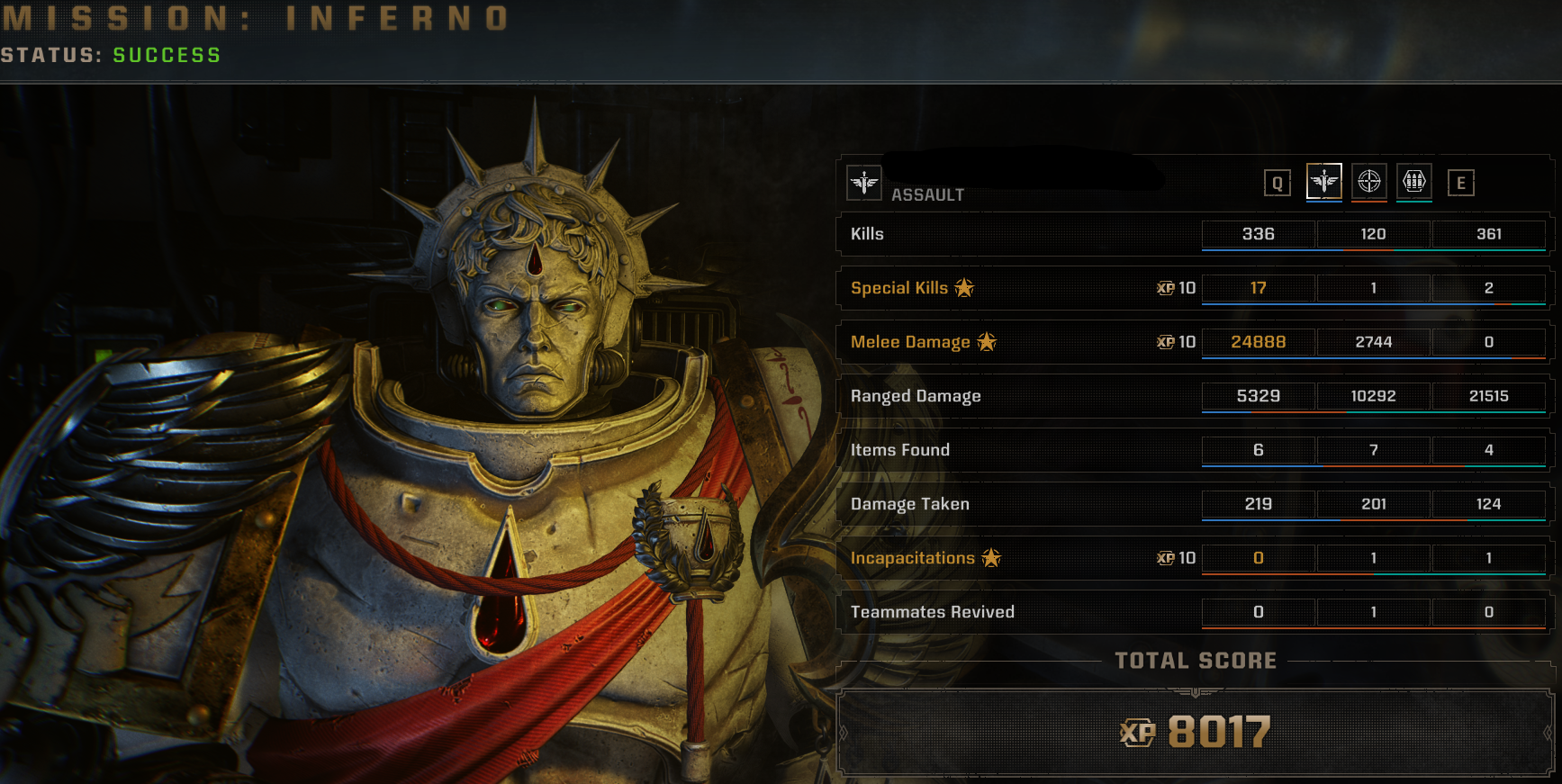 I wish I could say the Wings of Flame build is better than Bulwark simply being able to raise his shield and cancel out of any attack whenever he wants for free, but it's not. The shield cancel Just Works™ every single time, meanwhile Conviction won't proc occasionally even if you're colliding with the hitbox of a charging Carnifex and your dash attack has the tendency to not magnetise towards an enemy even if you're facing in their direction, meaning you won't get a charge back with Furious Strikes.Also it's bullshit that Bulwark can generate momentum from nothing and stagger enraged majoris with shield rush, which is very useful against Devourers and Venom Cannons on a melee class (where the shield is already useful against them for obvious reasons). Meanwhile Assault has to spend an entire unrefundable charge on a ground pound to achieve the same effect because his jump pack dash attack won't make them budge even though he's using fucking rocket boosters to propel his full weight (between 500kg-700kg btw) into an enemy.