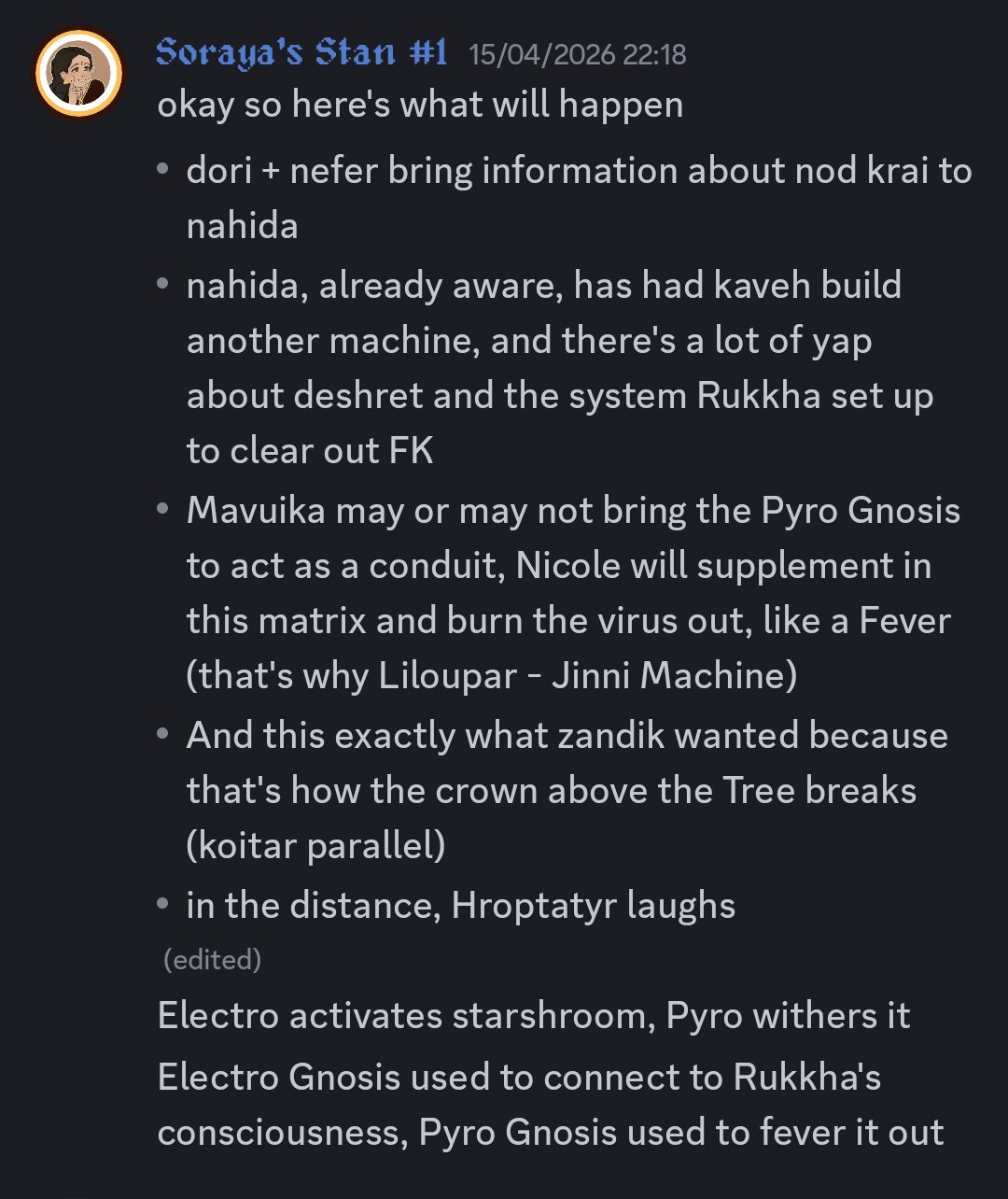 I saw an interesting theory saying that the new Irminsul may be created from Schizomouche's core. If that were the case, it'd explain how he becomes a "hero" to Sumeru.>Dottore forces Nahida to burn the old Tree>all retconned memories return to normal>Scara lends Nahids his core to use as a way to create a new Irminsul >now everyone is safe