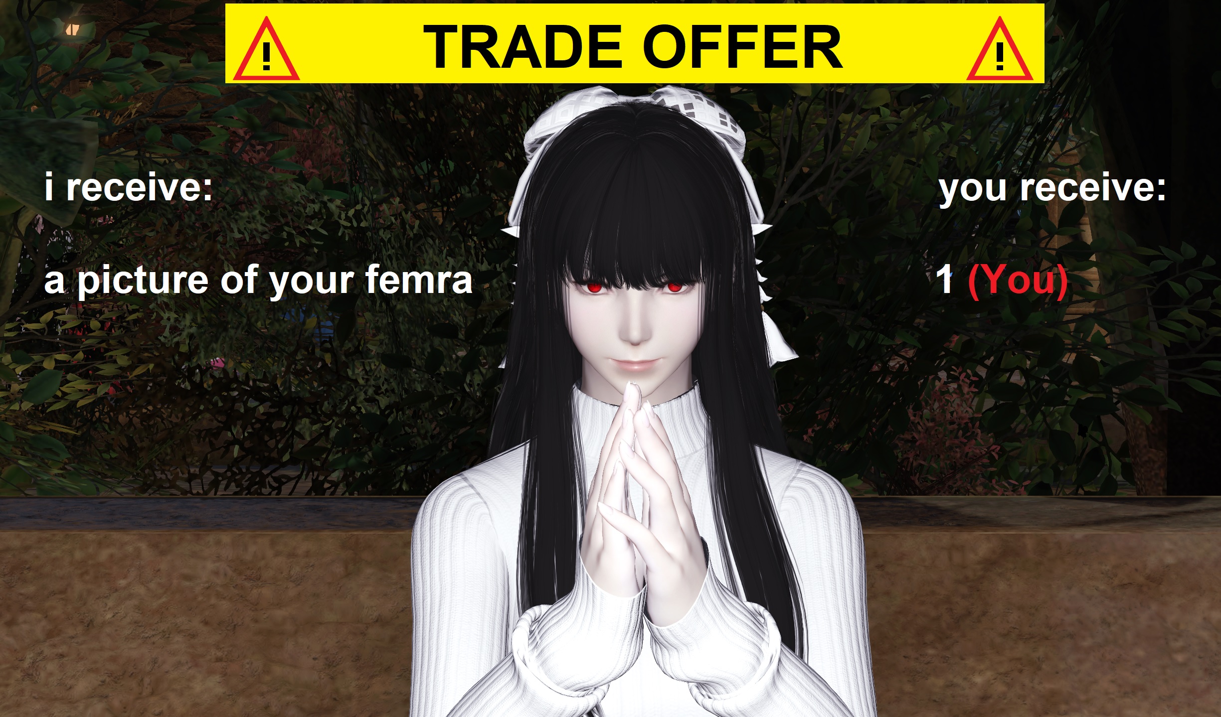 >>563870213was plapped with val moorabella after val was open to doing that because of their break up with lumy moonlightgot called wife by val repeatedlylater was told that "lol its just a meme" by valhas been schizod ever since