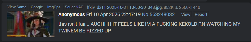 >noooooo, i complimented you and gave you a (you) this means you owe me sex now and if you dont give me what i want, you DESERVE to be shitposted!!/xivg/ is truly the toilet of xiv.