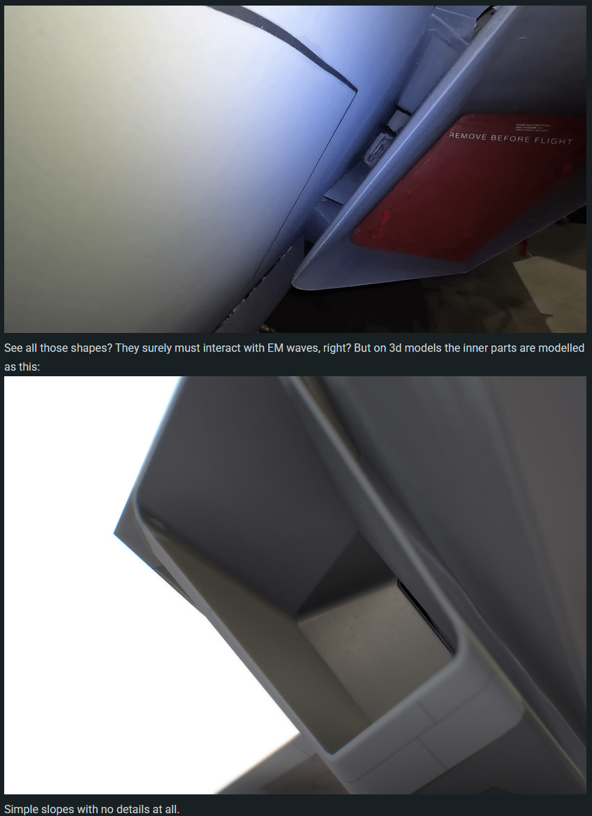 >>563993394your entire post is ChatGPT vomit for "b-but the IRST has radar absorbent material on it"not only is that only true when it's facing backwards, but it also has very little effect. radar absorbent material is for enhancing a design which has stealthy geometry, not for magically turning an unstealthy design into a stealthy one. you can't prevent a 10MW radar spotlight from frontally illuminating a sphere just by painting it dark. the su-57 is an unstealthy design, sukhoi has said so themselves, its designers have said so themselves, they have always said stealth was a secondary concern