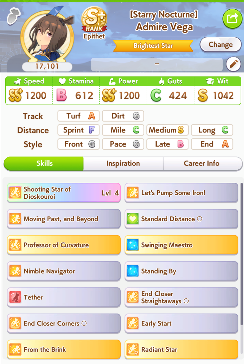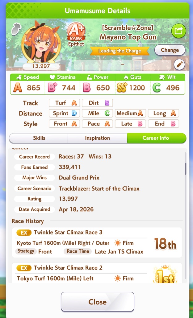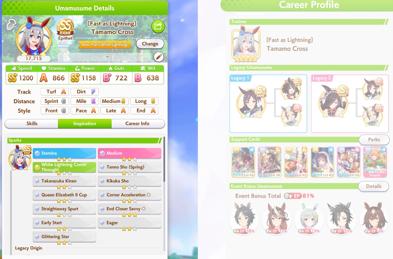 Previous: >>563870425>Global Game NewsLink your account to Cygames iDCurrent Scenario: Make A New Track aka "Trackblazer"Current Rate Up Trainee: Nishino Flower (3*), Ballroom Seiun Sky (3*), Ballroom Fuji Kiseki (3*)Current Rate Up Support Cards: SSR Daiwa Scarlet (Power), SSR Symboli Rudolf (STA), SSR Sirius Symboli (WIT), SR Sweep Tosho (Wit)Current CM: Aries Cup - Nakayama Turf 2000mCurrent Event: Ligne Droite Story Event>Schedule04/12 - Nishino Flower (3*), Daiwa Scarlet (SSR), Sweepy (SR)04/20 - Yaeno Muteki (3*), Ines Fujin (SSR), Twin Turbo (SSR)04/20 - Aries Cup - Medium/Right/Spring/Firm/200004/26 - Golshi Week Celebration04/26 - Cheerleader Nice Nature (3*), Cheerleader King Halo (3*), Bamboo Memory (SSR), Seeking the Pearl (SSR)04/26 - Tracen Cheer Squad Story Event04/30 - Ines Fujin (3*), MR. C.B. (SSR), Tokai Teio (SR)https://pages.snep.pw/uma/anni-skill-changes>JP Game NewsCurrent Rate Up: Lucky Lilac (3*), SSR Aston Machan, SR Hishi AmazonNew Scenario "Beyond Dreams" releasedTimeline: https://uma.moe/timelineCygames Webstore: https://webstore.cygames.com/en/umamusume_en>Thread Clubshttps://rentry.co/umaglobalclublistYou must be E3 (20k points) to join a circle. Apply with /uma/ or /vg/ in your profile or post ID in the thread.>All Guides & Resourceshttps://rentry.org/uma26Game databasehttps://gametora.com/umamusume (Click the gear to switch between JP / global server info)A basic guide for newfagshttps://rentry.org/umaglobalFind networks if your region is blocked from the game or clienthttps://www.umavpn.topSeiyuu & Concertshttps://rentry.org/umstUmamusume Birthday Calendarhttps://ウマ娘.攻略.tools/events/birthdayUma Texthttps://umareader.idsmile.xyzCustom Stickershttps://schizo.farm/resources/stickers