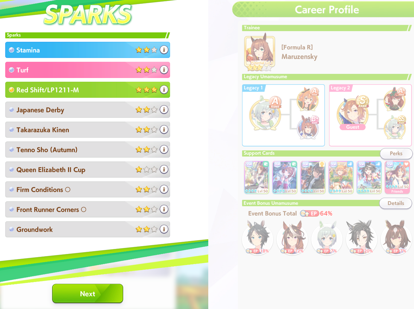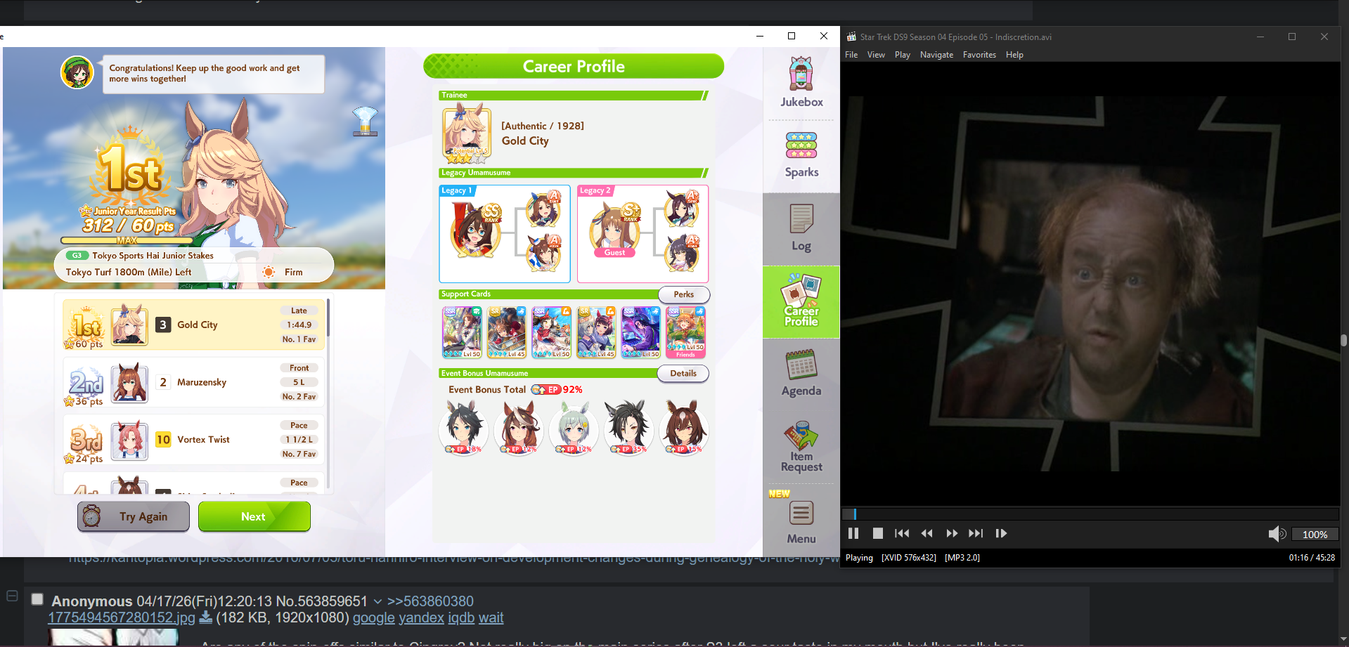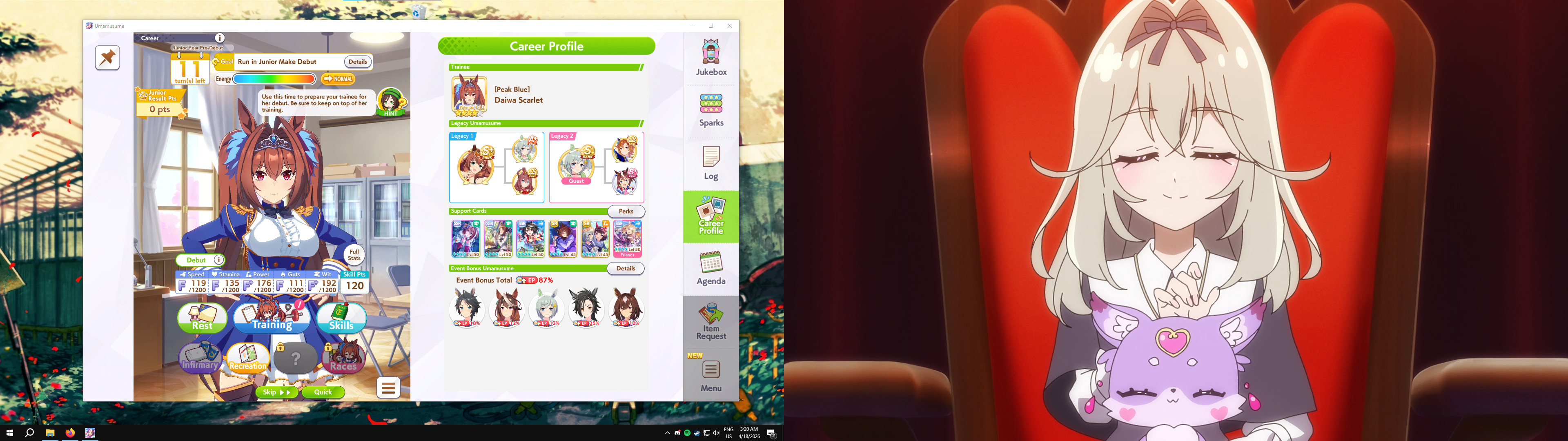 Previous: >>563870425>Global Game NewsLink your account to Cygames iDCurrent Scenario: Make A New Track aka "Trackblazer"Current Rate Up Trainee: Nishino Flower (3*), Ballroom Seiun Sky (3*), Ballroom Fuji Kiseki (3*)Current Rate Up Support Cards: SSR Daiwa Scarlet (Power), SSR Symboli Rudolf (STA), SSR Sirius Symboli (WIT), SR Sweep Tosho (Wit)Current CM: Aries Cup - Nakayama Turf 2000mCurrent Event: Ligne Droite Story Event>Schedule04/12 - Nishino Flower (3*), Daiwa Scarlet (SSR), Sweepy (SR)04/20 - Yaeno Muteki (3*), Ines Fujin (SSR), Twin Turbo (SSR)04/20 - Aries Cup - Medium/Right/Spring/Firm/200004/26 - Golshi Week Celebration04/26 - Cheerleader Nice Nature (3*), Cheerleader King Halo (3*), Bamboo Memory (SSR), Seeking the Pearl (SSR)04/26 - Tracen Cheer Squad Story Event04/30 - Ines Fujin (3*), MR. C.B. (SSR), Tokai Teio (SR)https://pages.snep.pw/uma/anni-skill-changes>JP Game NewsCurrent Rate Up: Lucky Lilac (3*), SSR Aston Machan, SR Hishi AmazonNew Scenario "Beyond Dreams" releasedTimeline: https://uma.moe/timelineCygames Webstore: https://webstore.cygames.com/en/umamusume_en>Thread Clubshttps://rentry.co/umaglobalclublistYou must be E3 (20k points) to join a circle. Apply with /uma/ or /vg/ in your profile or post ID in the thread.>All Guides & Resourceshttps://rentry.org/uma26Game databasehttps://gametora.com/umamusume (Click the gear to switch between JP / global server info)A basic guide for newfagshttps://rentry.org/umaglobalFind networks if your region is blocked from the game or clienthttps://www.umavpn.topSeiyuu & Concertshttps://rentry.org/umstUmamusume Birthday Calendarhttps://ウマ娘.攻略.tools/events/birthdayUma Texthttps://umareader.idsmile.xyzCustom Stickershttps://schizo.farm/resources/stickers