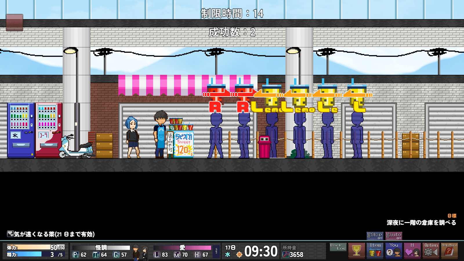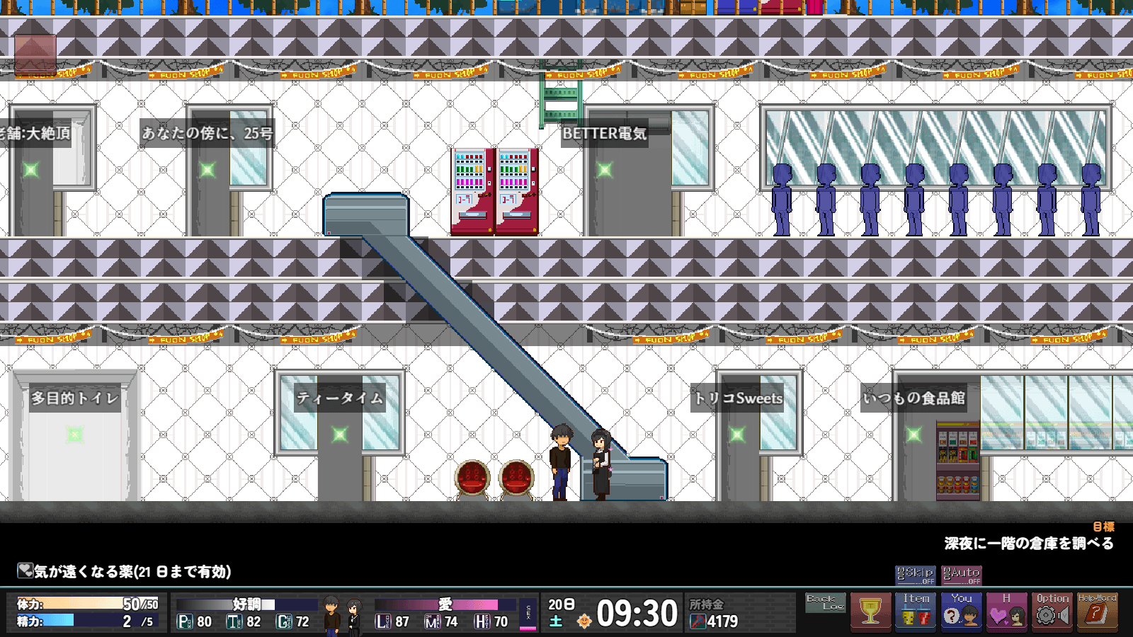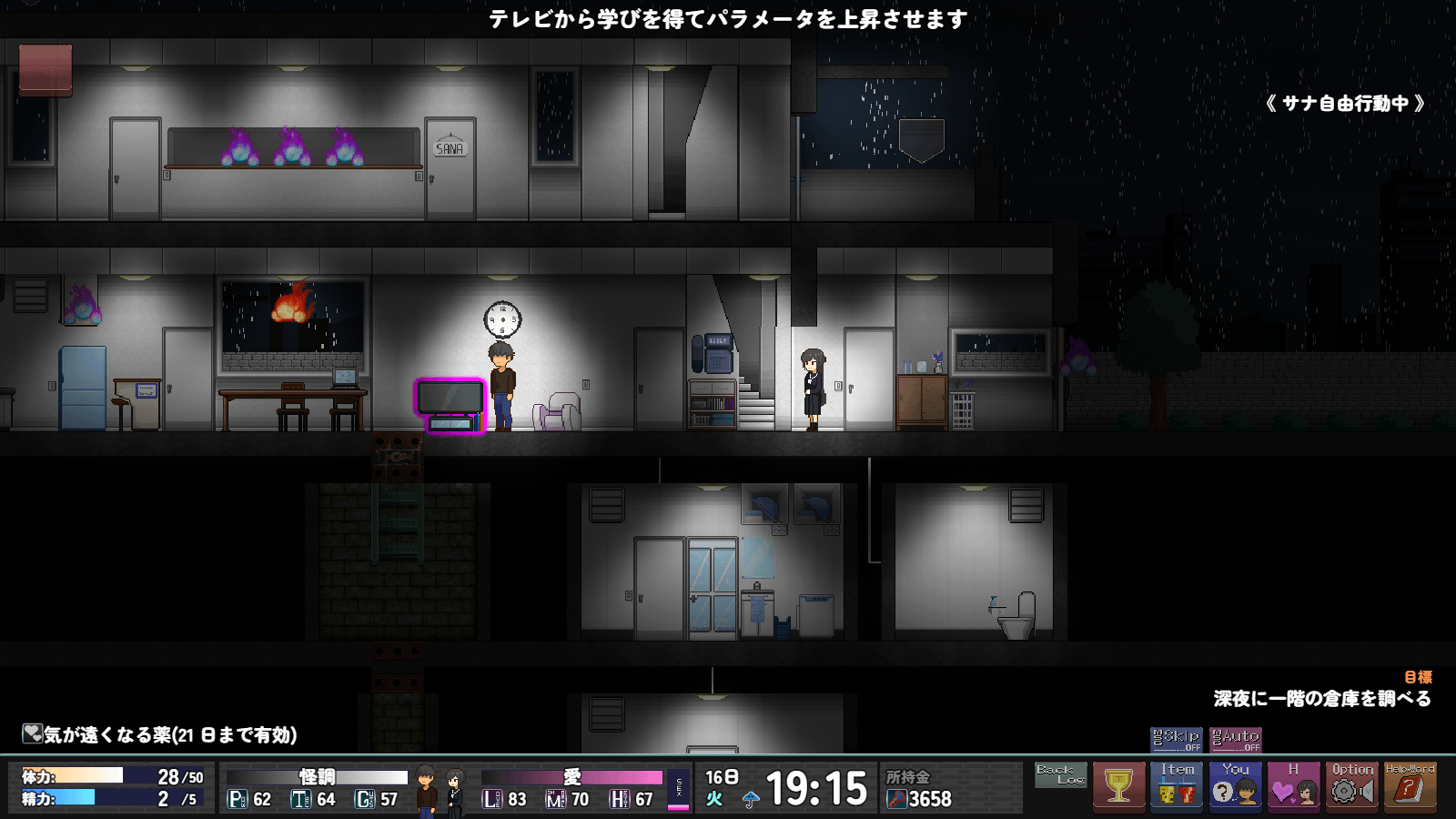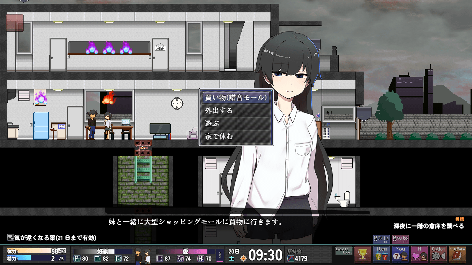 >>563906787Weekend Activities・Weekend activities. You can go shopping, go out, or rest.・Shopping… You can upgrade furniture and purchase adult goods, etc.・Going out… You receive a powerful buff effect that lasts for one week.・Rest… Use this if your stamina is low or to skip the weekend.