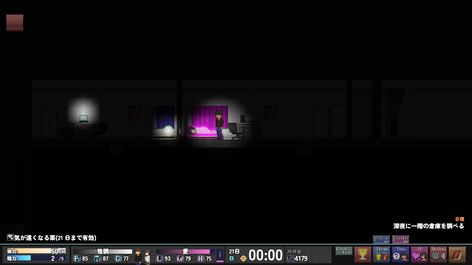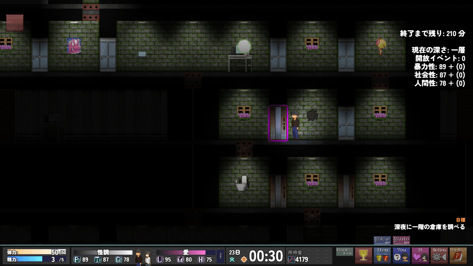 >>563907712Late-Night Exploration (Exploration) *Elements currently under review*・Main story segment. You can explore the underground late at night.・You cannot engage in “Sweet Dreams” sex while exploring.・At this stage, the game consists solely of inspecting room doors, consuming time, and progressing as far as possible.・Simple battles and events where you can obtain items may occur.・Report-related items are obtained here.・I had envisioned a bit of a hack-and-slash feel… but the elements are currently under review (it’s too heavy…).Looking at it again, there are a lot of unnecessary elements, and it seems like there are too many actions you can take in a single (in-game) day.I want to strike the right balance—considering both game balance and the player’s workload—and keep the pace from getting too slow…For now, I plan to focus on fleshing out the events in “1. Daily Life Part”while figuring out how to wrap up the story nicely!As long as the erotic events are solid, I’ll call it a success!!But I’m so anxious…See you later!