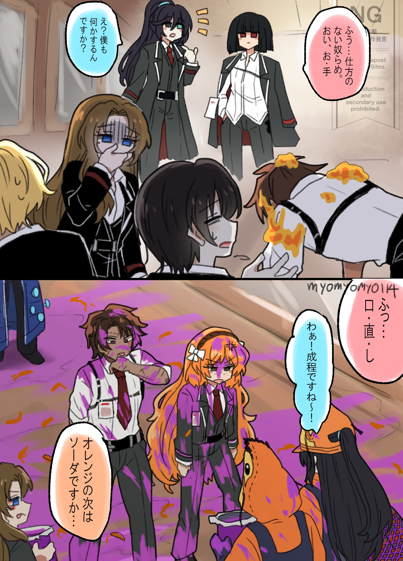 >>563907116>R: Hoo... what a hopeless bunch. Hey, H.M.>H: Huh? Do you need me to do something too?>R: Hoo... P.C.>H: Wow! I see~!>I: So you went from orange to soda, huh...>Sinclair, translateHM=Help mePC=Palette Cleanser