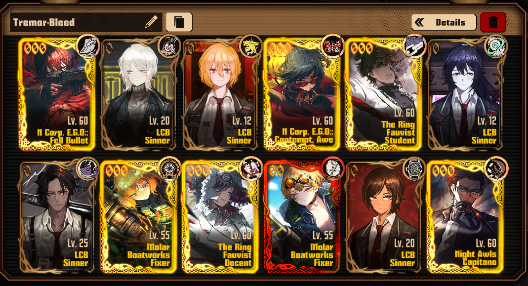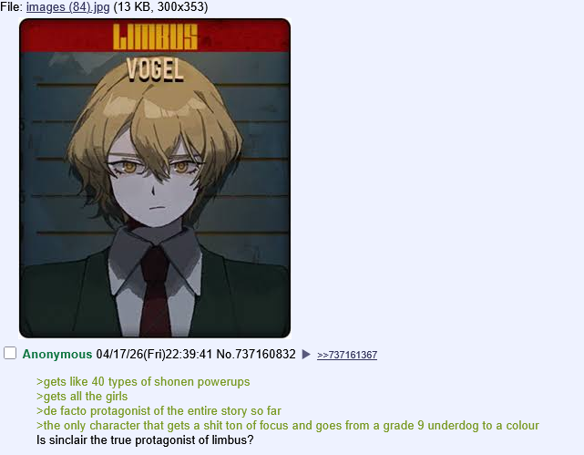Previous thread: >>563882515Season 7 - Kumo no Ito2025.12.31 —Mirror Dungeon #7 - Mirror of Names and Spiders2026.02.19 —Refraction Railway Line 5 - Merry Go Round2025.02.20 —>Current Events2026.04.16 — 2026.05.14Chapter 9.5 - Twining Threads>Current Extractions2026.04.16 — 20236.04.30[000] The Ring Fauvist Docent Rodion[000] The Ring Fauvist Student Meursault [ Event Reward ]2026.04.16 — 2026.04.30Target Extraction: [ Don Quixote ]FAQs! This game is directly tied to the setting of Project Moon's previous games, Lobotomy Corporation and Library of Ruina, and is set after both. Expect spoilers for those games in this thread.! The tutorial is important.>Download linksAppStore: https://apps.apple.com/app/limbus-company/id6444112366Google Play: https://play.google.com/store/apps/details?id=com.ProjectMoon.LimbusCompanySteam: https://store.steampowered.com/app/1973530/Limbus_Company/>Other linksOfficial twitter: https://twitter.com/limbuscompany_bOfficial youtube: https://www.youtube.com/@ProjectMoonOfficialOfficial site: https://limbuscompany.global>Required readinghttps://mega.nz/folder/xosDkZ5Z#Wt4JpUt5Bb2XG77pxuuXpw>For all your EGO and Sinner info needshttps://limbus.kusoge.xyz/https://gll-fun.com/en/>Useful resources and a general guidehttps://rentry.org/lcg_resourceshttps://rentry.org/lcbguidehttps://rentry.org/LCB_optimal_grind_guidehttps://lcb-days-since-last-id.carrd.co/https://lcb-days-since-last-ego.carrd.co/>Countdownhttps://lcbcountdown.carrd.co/