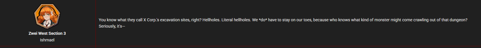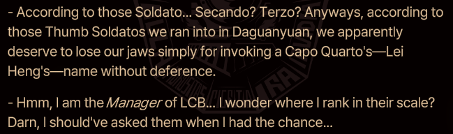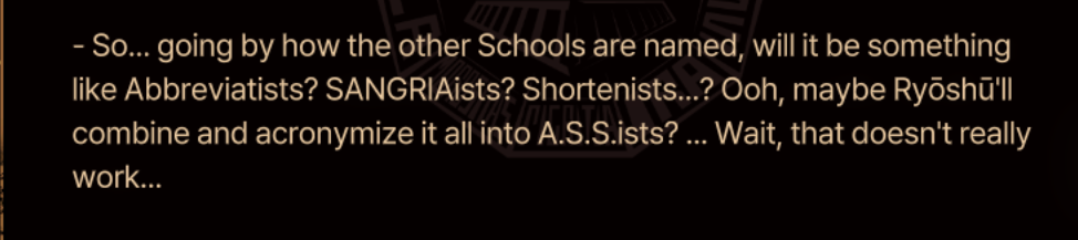 >>563925990The Society for Researching the Index mentioned in one of the generic Index mob’s passives has people wondering if the different transmission methods for Prescripts are from different entities, so this is an acknowledged mystery within the setting that will likely be explored, probably in the context of establishing different sub-factions within the Index like what has been done for the Thumb (Settle Famiglie who probably have their own unique combat styles like Palermitan Style) and the Ring (the Schools and their different art movements).