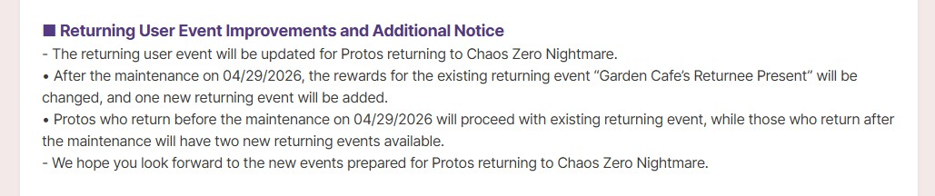 >>563952745> After the maintenance on 04/29/2026, the rewards for the existing returning event “Garden Cafe’s Returnee Present” will be changed, and one new returning event will be added.> Protos who return before the maintenance on 04/29/2026 will proceed with existing returning event, while those who return after the maintenance will have two new returning events available.Presumably the new ones are better but I don't think we have any specific info on them.