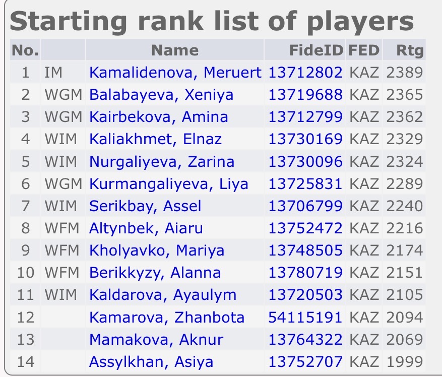 >>564023369Also they are very underrated in a chess sense. Alua doesn’t look like she’s playing the Kazakhstan women’s championship which I’m disappointed by but I’m guessing she wants to preserve her peak 2443 rating. Last tournament was a blood bath as all these girls are very strong and likely underrated to some degree while knowing each other’s playstyles very well. Xeniya Balabayeva who was 3rd board at the last Olympiad and most likely their next women’s IM lost 60 Elo in last year’s tournament and was down over 100 at one point. I don’t know if they can overtake India and full-strength China at this very moment but it seems obvious to me women’s chess will be dominated by Kazakhstan in 5-10 years.