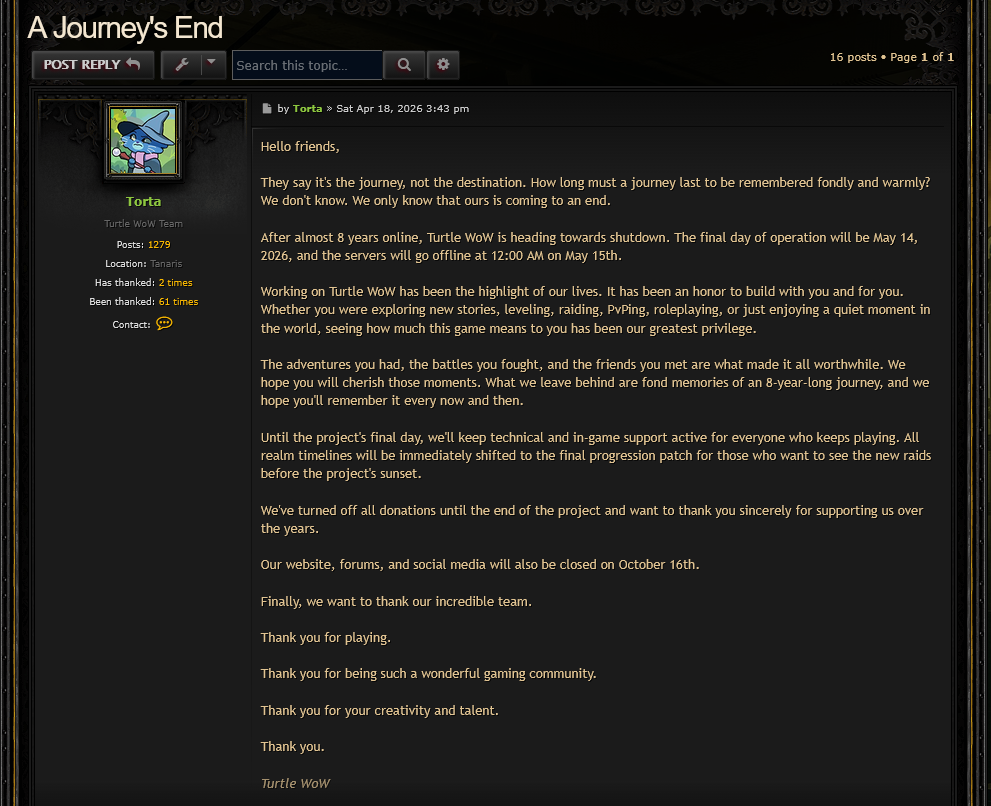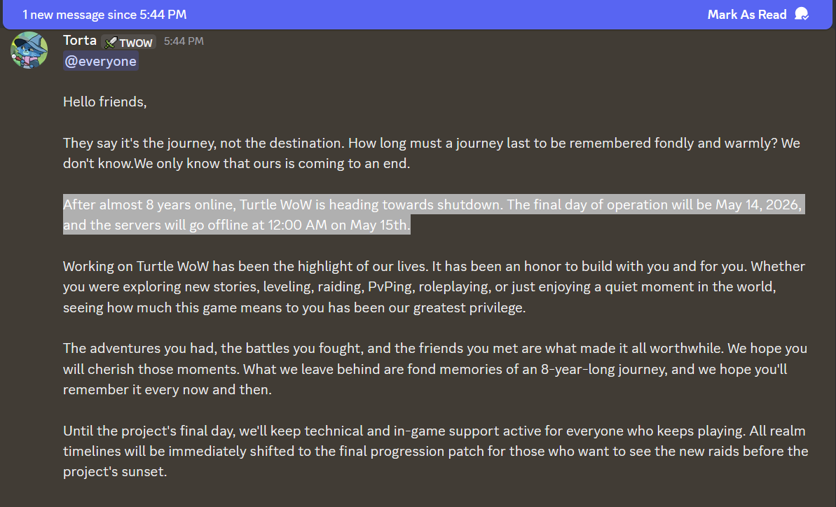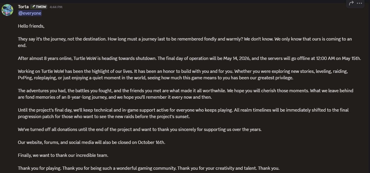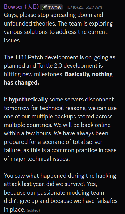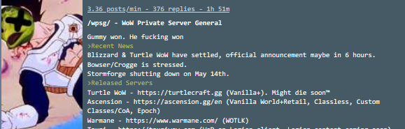 Gummy won. He fucking won>Recent NewsBlizzard & Turtle WoW have settled, official announcement maybe in 6 hours. Bowser/Crogge is stressed.Stormforge shutting down on May 14th.>Released ServersTurtle WoW - https://turtlecraft.gg (Vanilla+). Might die soon™Ascension - https://ascension.gg/en (Vanilla World+Retail, Classless, Custom Classes/CoA, Epoch)Warmane - https://www.warmane.com/ (WOTLK)Tauri - https://tauriwow.com (WoD on Legion client, Legion content coming soon). Stormforge was Tauricore so they're also in dangerChromiecraft - https://www.chromiecraft.com/en/ (PVE, progressive)>Active GuildsType /who g-"Guild Name" to see who's online, then whisper anyone for an invite. If you search Evil, sort by "Guild" (not "Zone") to filter the list.<gulag> - Tauri, Evermoon realm, Alliance<Evil> - Turtle Wow, Ambershire realm, crossfaction, raids at 18:00 server time<Branded> - Turtle Wow, Ambershire realm, crossfaction, raids at 20:00 server time >>>/trash/heals guild>BBC+https://github.com/ascensionhandynotespoi/HandyNotes_Ascension_POIhttps://bronzebeardmaps.pages.dev/>TurtleAll Turtle addons (copy & paste github links on the launcher) - https://turtle-wow.fandom.com/wiki/AddonsMisc - https://database.turtlecraft.gg | https://talents.turtlecraft.gg | https://twow.link/classchanges | https://turtletimers.com>Mods, Tutorials and /wpsg/ Creationshttps://pastebin.com/9C4nXnUC (embed)>Previous Thread: >>563887627