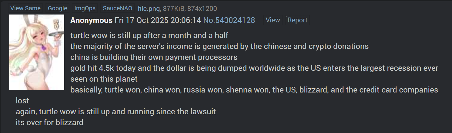 >>563962363>all these blizzard shill apologists replying to this acting like it is completely fine that Turtle is getting shut downOur general is being raided right now