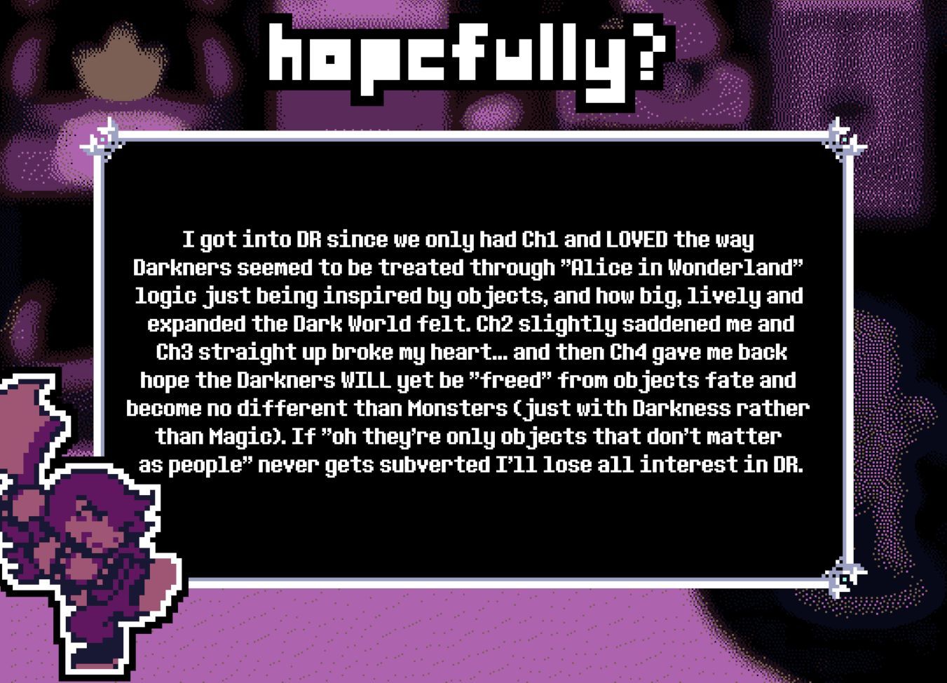 >>564047075If Chapter 5 has a Festival Dark World I think it will be the "Susie finds out all the townsfolk she treated like NPCs are all real people with their own problems to deal with" chapter