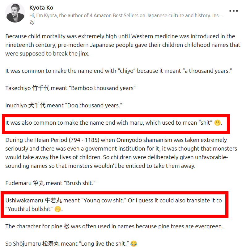 >>564030608>Japanese historian with multiple published books>Amazon best sellertop kek, if you understand publishing you'll know 'best seller' means fuck all.Kyota Ko is a historian in the meme internet influencer/ pop science sense. Fucking Neil deGrasse has more credibility. Meanwhile you can search 丸 on plenty of historical texts by plenty of other academic authors, both contemporary and historical and the explanation generally point to the fact that maru (round) is a wordplay from 円満, which means fulfilling, peaceful but has the literal meaning of 'round' and 'full'. THAT's why they like naming kids and boats with -maru suffix. Because you are hoping/ blessing that the kid will lead a fulfilling life and that ships' journey will be bountiful/ safe.Also>.. LE wrong>Why? because I say soUsing this reddit reductive meme in 2026 shows you are indeed those brainrot retards who just parrot shit without actually looking at the context or sources.>>564030982see above