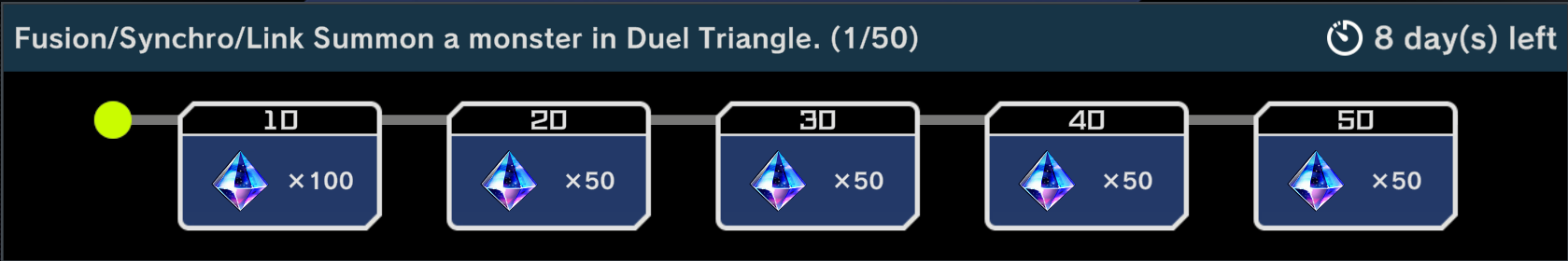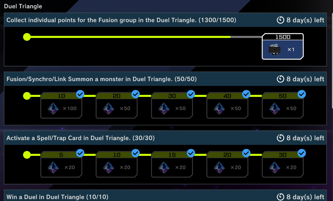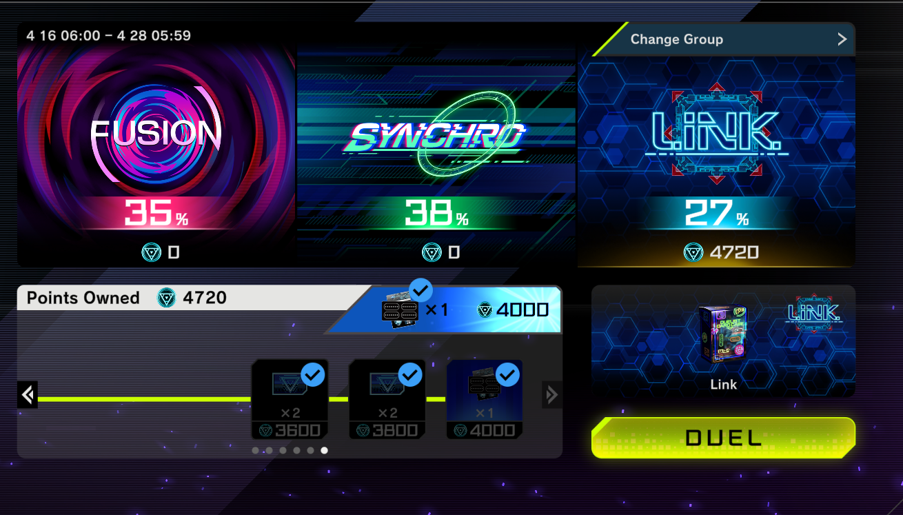 #1184: Why Aren't You Playing Links Yet editionPrevious: >>563811458Yu-Gi-Oh! Master Duel is an online multiplayer videogame using the Master Rule Format.>Offline Modhttps://github.com/pixeltris/YgoMaster>Other Modshttps://www.nexusmods.com/yugiohmasterduel/mods/>Current PacksSelection:Challenger's Selection (Staples)The Frenzied Tuning (Kewl Tune, Rose, R.B.)Generation of Bravery (Masked Hero, Magnet Warrior, Illusion Gate)The Drastic Storm (DoomZ, Radiant Typhoon, /Assault, Gouki)Secret:Transmigration Reactor (Materiactor, Full Armored, Rank 3)Transfigured Heroes (AA M Hero Dark Law, Mask Change)Shrouded Heroes (AA D Hero Plasma)Darkest Magics (AA Dark Magician, Secrets of Dark Magic, Dark Magical Circle)>Current EventsDuel Triangle Fusion/Synchro/Link Apr 15th - Apr 27th1500 Days since Launch Campaign until Apr 23rd>BundlesKewl Tune Collection - 2000 GemsDestiny HERO Collection - 2000 Gems4th Anni: Dark Magician Collection - 1800 GemsUseful resources for info on Decklists, Events, etc.>YGOPro Deckhttps://ygoprodeck.com/category/master-duel-decks/>Road of the Kinghttps://roadoftheking.com/>Appmedia (only in Jap)https://appmedia.jp/master_duel>List of Secret Packshttps://yugipedia.com/wiki/Secret_Pack>Official Master Duel Pagehttps://www.konami.com/yugioh/masterduel/en/>Yu-Gi-Oh! Probability Calculatorhttps://yugioh.otterlord.dev>Small World Helphttps://small-world.yugioh-api.com/resolve>New Player Guidehttps://files.catbox.moe/95jg6n.jpg>Master Duel Metahttps://www.masterduelmeta.com/