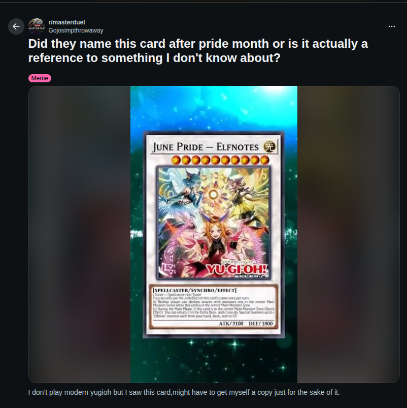 So let me get this straight>Be Konami>Release cool robot archetype>It has 5+ hits on release>Release maltroon archetype>No hits and game begins to die>Finally kill deck>Release another cool original ritual reptile archetype>Game is finally fun again>Release Dracotrans which is an anime furry deck with no hits>Release furry yummy archetype>Release another furfaggot trans deck in k9 vanquish soul>Game dies again>Now release gay troons>more moe slop pandering to fat otaku manchildren redditors and troonsWhen will we get a deck with REAL monsters like pic related MDG?