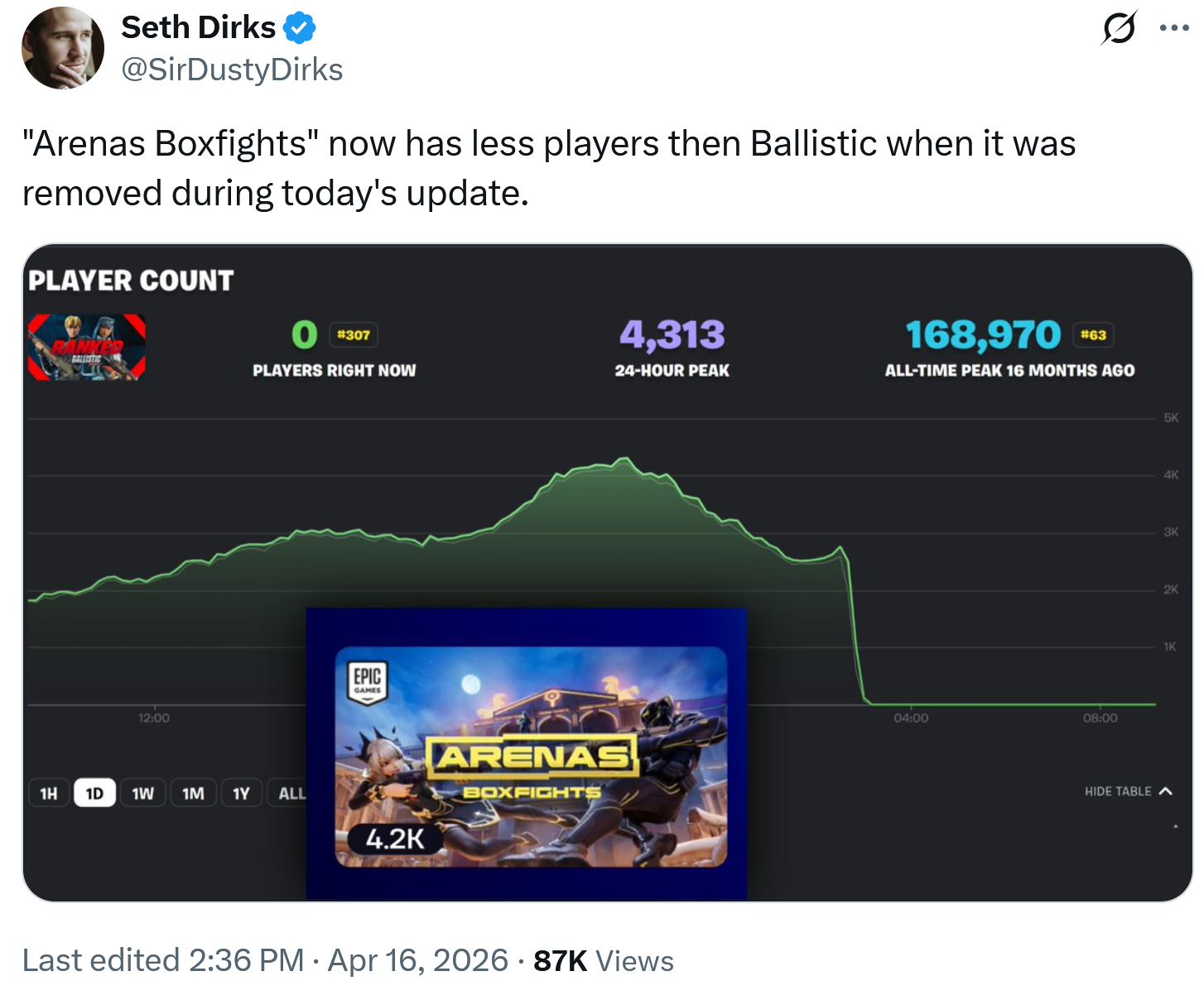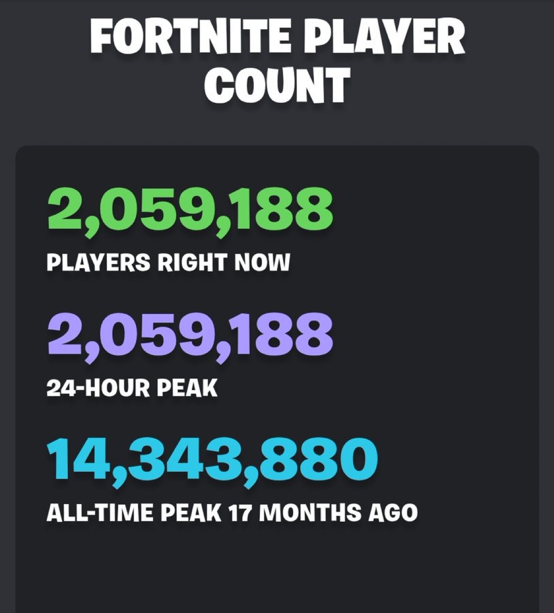 >>564040987It also doesn't account for regions/countries and other things. I know it's fuck early on a Sunday in the US, but this is the current player count for Epic stuff. >BR/ZB - 207.5K>RD - 90.8K>BZ - 10.6K>FF - 7.6K>STW - 44.7K>LEGO - 26K>LBR - 2K>ABF - 5.8K>ResRum - 205>ParRoy - 600