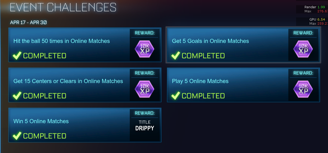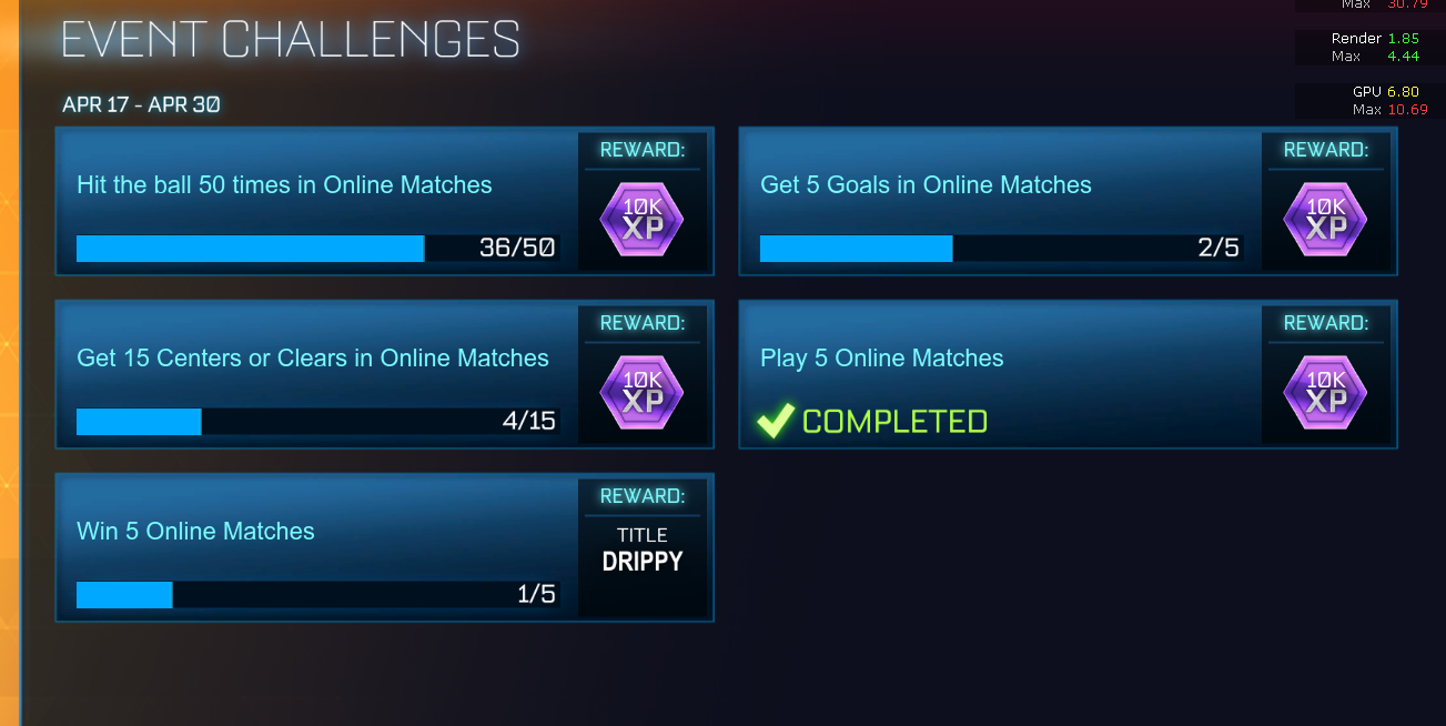 >>564048245>Play Online Matches 5/5>Win Online Matches 1/5I understand how miserable Rocket League can be. I grinded for the challenge last night which requires an overtime win for a black market drop, and only has a 3 day window to complete. Took 17 matches to do. Couldn't even get into overtime until the 10th match, only for horrible luck to result in an instant loss. I ended up having to start tanking to push matches into OT, and even then it was a struggle to get there.