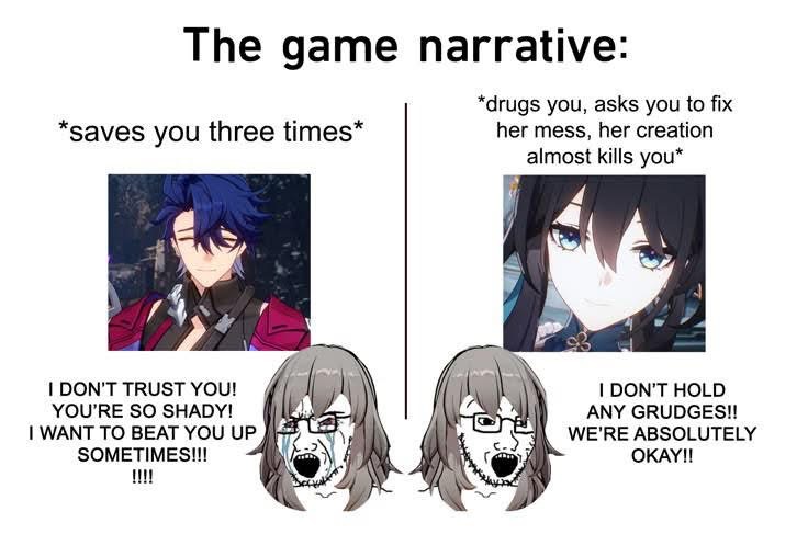 Firefly was a mistake. Like this was a chance to waifu SW and they shove Firefly in there? Like what the fuck. They don't even make her sit next to TB in the end. Imagine if this happened to other gacha. I think even Nikke allows the supposed main wife Rapi to get sidelined once in a while to shill the new girl.