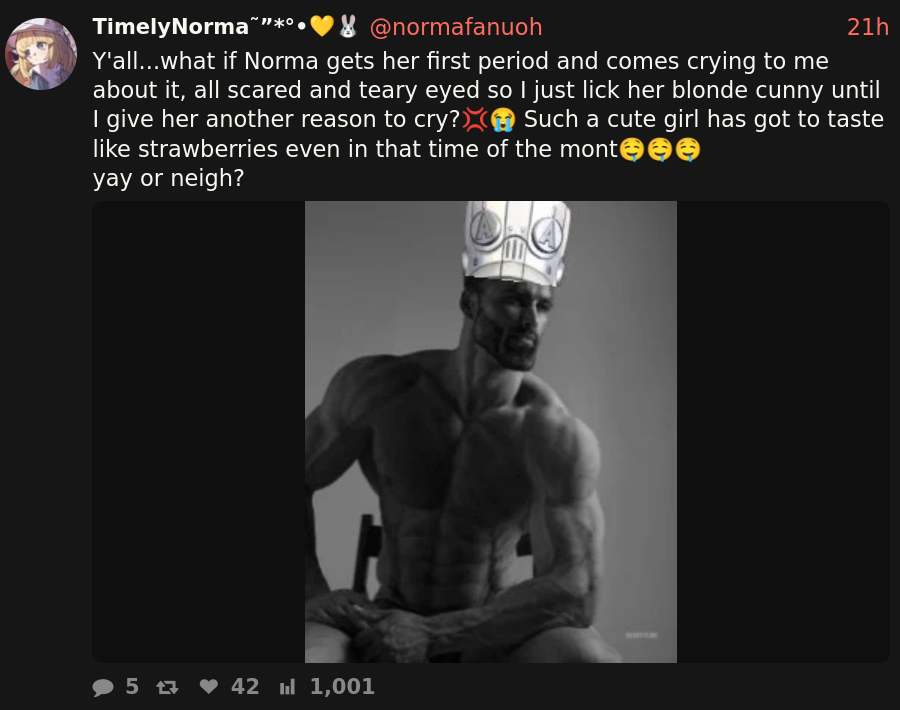 >>564032178Horsey circles around scat, cuckshit and circlejerking his name around seething at the idols. He posts cat torture and pizza when he is VERY angry.