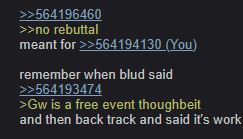 >>564196460>>no rebuttalmeant for >>564194130remember when blud said >>564193474>Gw is a free event thoughbeitand then back track and said it's work because it no longer favors his argument? what was that about?oh also blud still cannot address as to why the Fukuoka event were cancelled despite getting recorded attendance in their real life events?where is the rebuttaltothat?