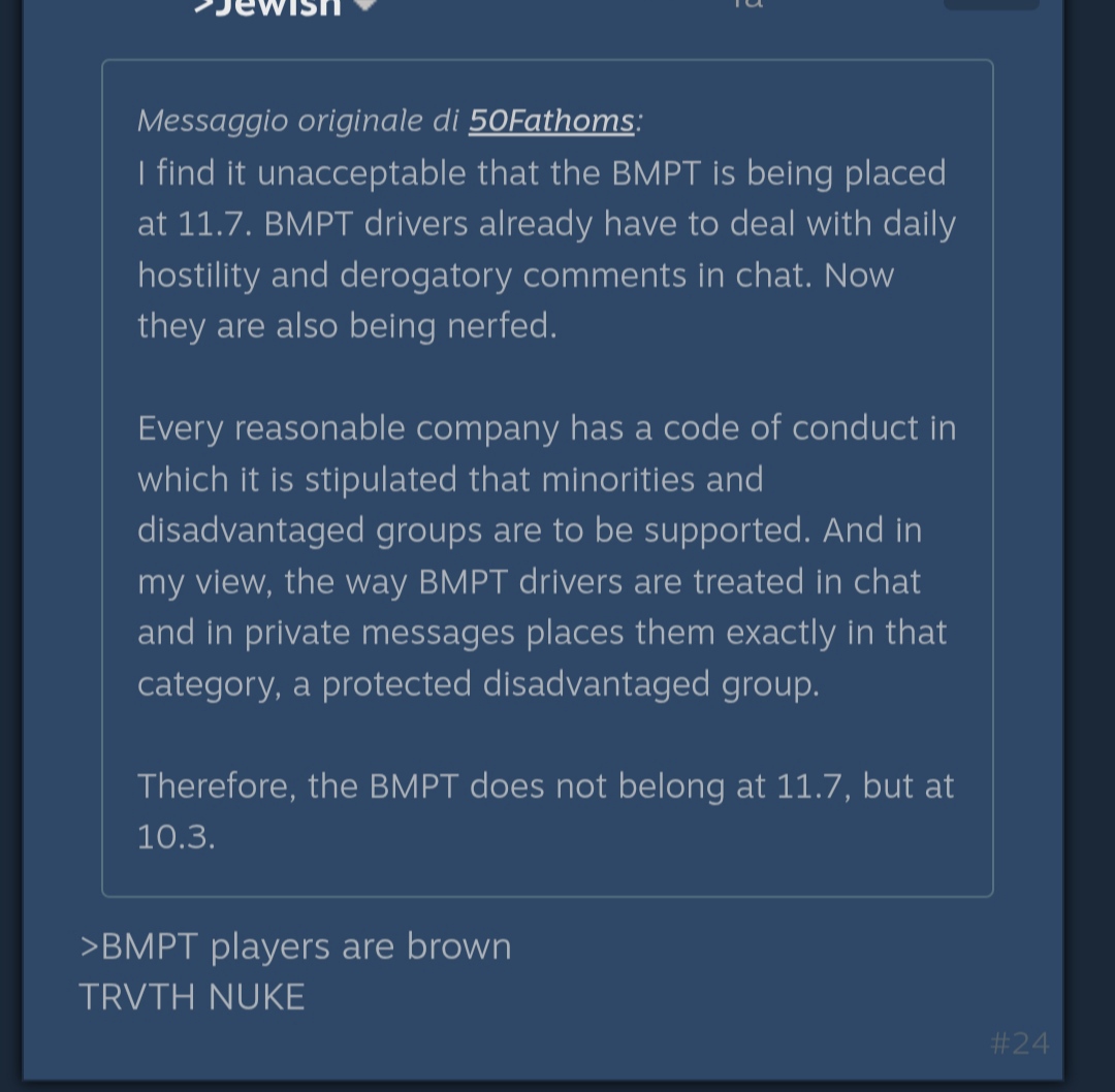 >>564269742The game is just objectively worse compared to 2020Volumetric as always allowing for impenetrable pixels to void shotsArtillery and bomb explosion smokes used to clear in 2s flat and now it's a whole 10's of smokescreenTanks used to be able to climb an incline of 5 degrees or more with easeThe amount of irritating clutter on maps was substantially lessThe damage model for air & ground wasn't completely fucked with retarded bandaid patches that mean a single HE shell blows wings off and a cupola shot blows transmissions upThe audio worked consistently and the sounds of vehicles were greatPantsirs didn't exist yetLMUR's didn't exist yetKH-38MT's didn't exist yet (they still don't exist now kek)The map rotation was some form of sinai half the time, instead of seversk 13The game has gone downhill so hard since 2020I don't have hope for infantry as the test was awful, sim view for vehicles against a billion fpv drones and roof campers? Shows gaijin is just throwing shit at a wall to see what sticksAnd yeah I don't have many hopes for nuclear thunder seeing as gaijin refused to touch the AA and nerfed the most fun part of the mode (the PVP)