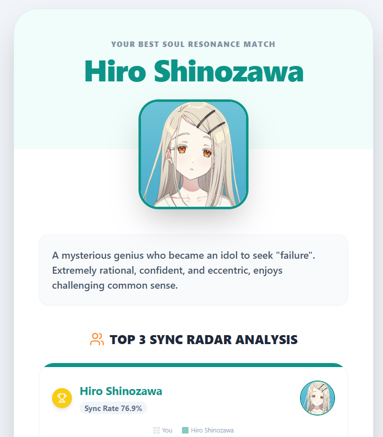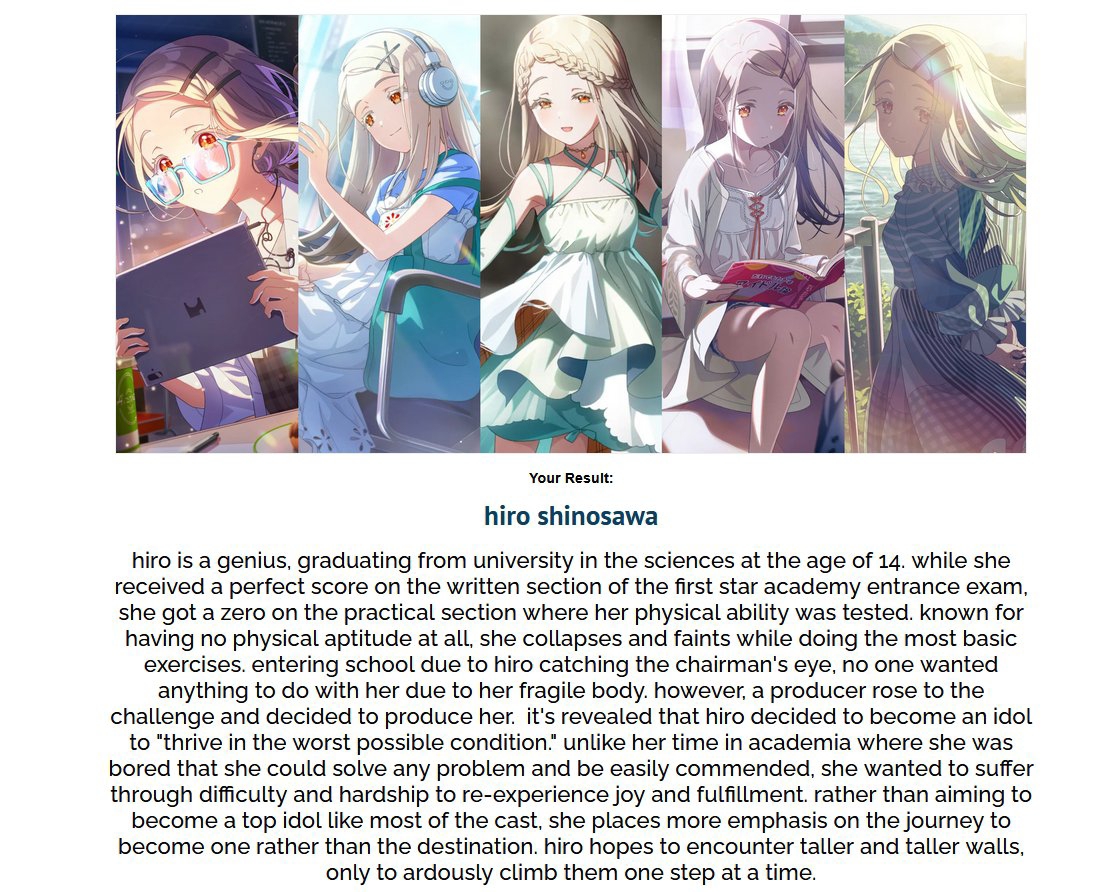 >>564109081I did this one too and it gave me Temari but this one was just a bunch of shit. It asked about fucking Chikuuwa and rainbows and abstract paintings and shit