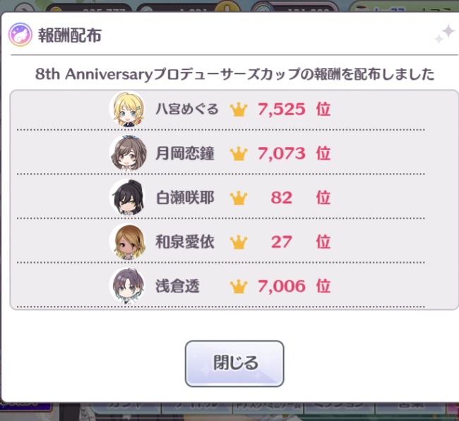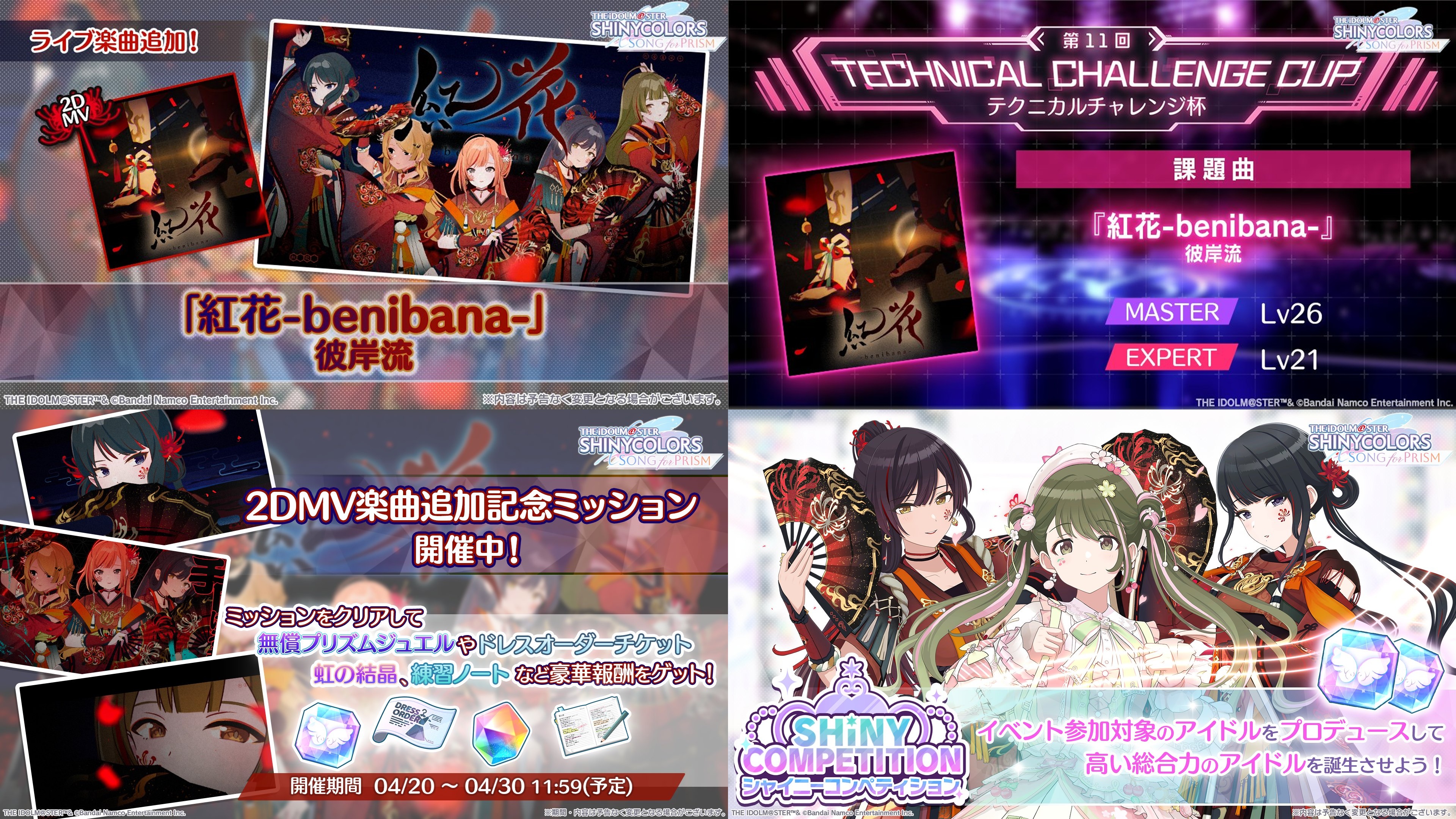 >>564159764SHINY COLORS>>Event04/17 - 04/29 Rerun Scenario "THE(CoMETIK)EPISODE" (SSRS Luca)04/02 - 05/12 8th Anniv Special Mission #104/17 - 05/12 8th Anniv Special Mission #204/17 - 05/21 11:59AM JST "Spring Idol Training Week" (SRS Madoka)>>>Gacha04/09 - 04/29 Casting Collection (SSRP Natsuha, SSRP Toru)04/17 - 04/29 8th Anniv #3 Once-a-day Free 10 Roll>>Has Normal and Paid Jewels Only version04/11 - 04/29 Prelude Collection (SSRS Fuyuko)04/17 - 05/12 "The Growth Curve of Songs and Knowledge" (URP Kiriko, URS Asahi)>>Paid Jewels Only04/09 - 04/29 8th Anniv Twilights Collection & Parallel Collection & My Songs Collection & Limited04/09 - 04/29 8th Anniv Parallel Collection Special Training Hazuki04/09 - 04/29 Recommended Idol for Fes (Houkago Climax Girls, noctchill)04/09 - 04/29 Casting Collection Link "Theme: Voice" {Max: 3}04/17 - 04/29 8th Anniv Guaranteed Twilights Collection SSRP/SSRS04/02 - 05/12 8th Anniv SSR 2X Chance! Twilights Collection & Parallel Collection & My Songs Collection & Limited04/17 - 05/12 8th Anniv Produce Idol With Special Training Hazuki04/17 - 05/12 8th Anniv Support Idol With Special Training HazukiSONG FOR PRISM>>Event04/20 - 04/23 8:59PM JST 11th Technical Challenge Cup04/20 - 04/24 8:59PM JST 14th SHINY COMPETITION03/28 - 04/28 Season 30 "Soft Skin" (SSR Toru)03/20 - 04/30 Portrait Focus Mode Mission #304/01 - 04/30 Story "With the President" (SR Amai)04/01 - 04/30 Dress Swap "4lternative 1dentity"04/20 - 04/30 New 2D MV Song Mission04/12 - 05/17 Shiny Runway 2026 Spring Collection Mission>>>Gacha>>Has Normal and Paid Jewels Only version04/18 - 04/24 11:59PM JST JST Happy Birthday (3* Chiyuki)03/31 - 04/30 "PJ: REFRAC7IONS - Higanryuu" (3* Lim Hiori, 3* Lim Mei, 3* Lim Natsuha, 3* Lim Sakuya, 3* Lim Chiyuki)04/20 - 04/30 "Spring in Full Bloom, Flower Dream" (3* Nichika, SSR Nichika)>>Paid Jewels Only04/01 - 05/17 April 2026 Guaranteed 2* 10 Rolls