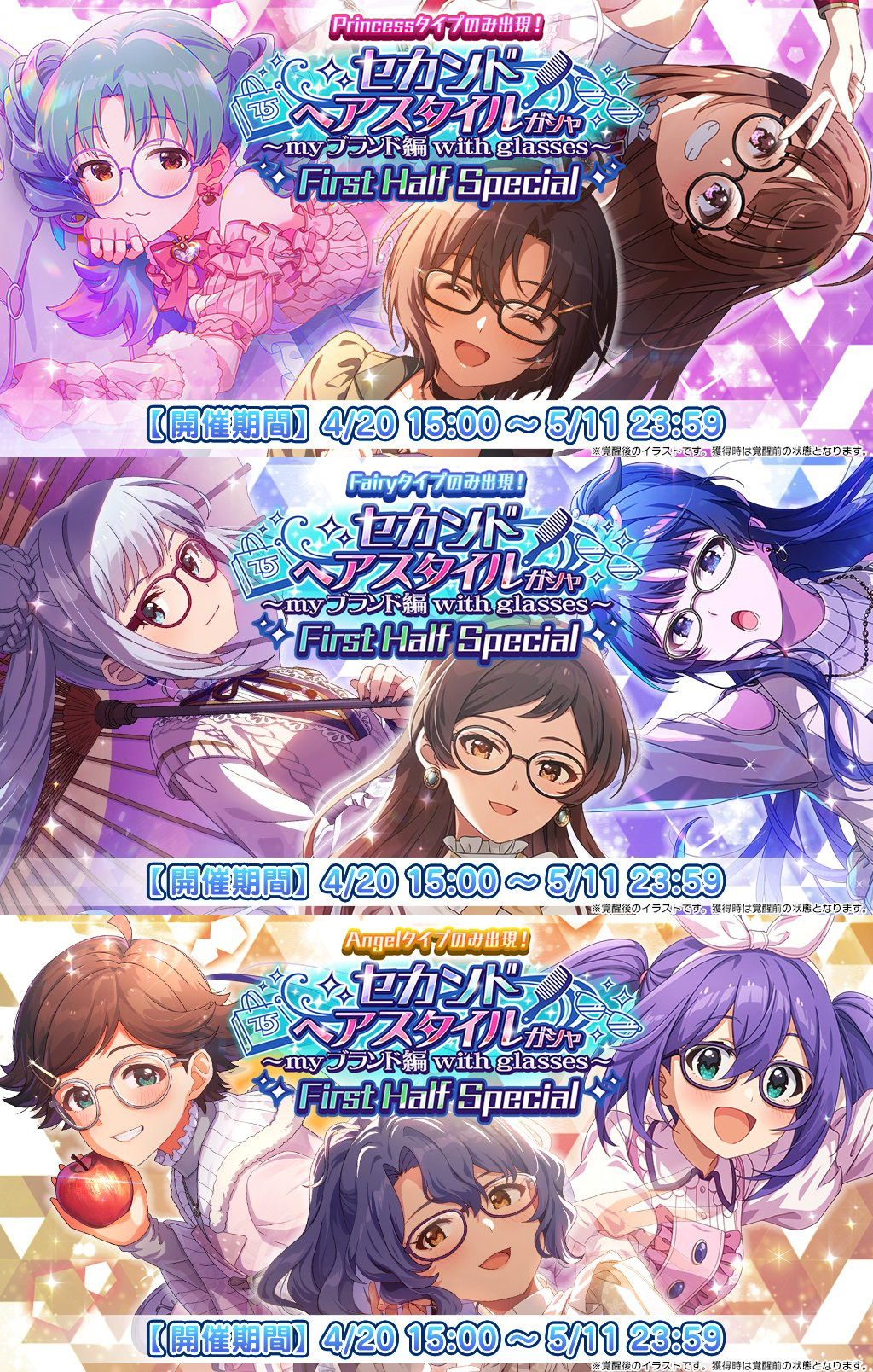 Helpful Linkshttps://pastebin.com/EuB8uUTmSTARLIGHT STAGE>>Event04/01 - 04/30 SSR Recruitment Challenge06/22 12AM JST - 07/05 LIVE Carnival ~2026 Summer~>>>Gacha2025/09/22~ Platinum Audition Once-a-day Free 1 Roll04/15 - 04/23 11:59PM JST Premium Audition04/15 - 04/23 11:59PM JST Dominant04/15 - 04/23 11:59PM JST Limited Skill Pick04/24 12AM JST - 04/30 Cinderella Fes Blanc04/24 12AM JST - 04/30 Cinderella Fes Noir>>Paid Jewels Only04/24 12AM JST - 04/30 Premium Audition Blanc {Max: 3}04/24 12AM JST - 04/30 Premium Audition Noir {Max: 3}THEATER DAYS>>Event04/18 - 4/25 8:59PM Platinum Star Trust ~Stick to my weapon~ (Julia, Yayoi)2025/07/17 - 06/28 8th Special Training2025/07/23~ 52 Weeks Continuous CD Release Campaign >>>Gacha04/18 - 4/26 2:59PM JST Monthly Alternative [REVIVE] "Kuraki Hoshi, Tooi Tsuki" (Megumi, Subaru, Yukiho, Tamaki, Roco)>>Paid Jewels Only04/20 - 05/11 Second Hairstyle ~my brand with glasses~ First Half Special [Princess Only, Fairy Only, Angel Only]{Max: 1 per type}GAKUEN>>Event04/20 - 04/29 Asari-sensei's Producing Seminar04/16 - 04/30 Contest Season 4303/09 - 05/13 Producer Ranking Season 204/04 - 05/16 9AM JST Rerun Affection Boost Campaign (Sumika, Hiro, Kotone, Rinami, China, Mao, Lilja, Temai, Sena, Saki)>>>Gacha04/10 - 04/20 10:59AM JST "Masshiroi Page to Suisai no Shujinkou" (Ume)04/13 - 04/21 10:59AM JST Rerun "Yukidoke ni" (China, Mao)04/13 - 04/21 10:59AM JST Another Idol '26 Hinamatsuri04/21 11AM JST - 04/29 Rerun Sakura Photograph (Sumika, Saki)04/21 11AM JST - 04/29 Another Idol '26 Cherry Blossom03/18 - 04/30 Supporting the Next Chapter of Your Life! Up to 100 Free Rolls! Daily 10 Free Rolls>>Paid Jewels Only04/13 - 04/21 10:59AM JST Another Idol '26 Hinamatsuri Guaranteed SSR {Max: 1}04/21 11AM JST - 04/29 Another Idol '26 Cherry Blossom Guaranteed SSR {Max: 1}
