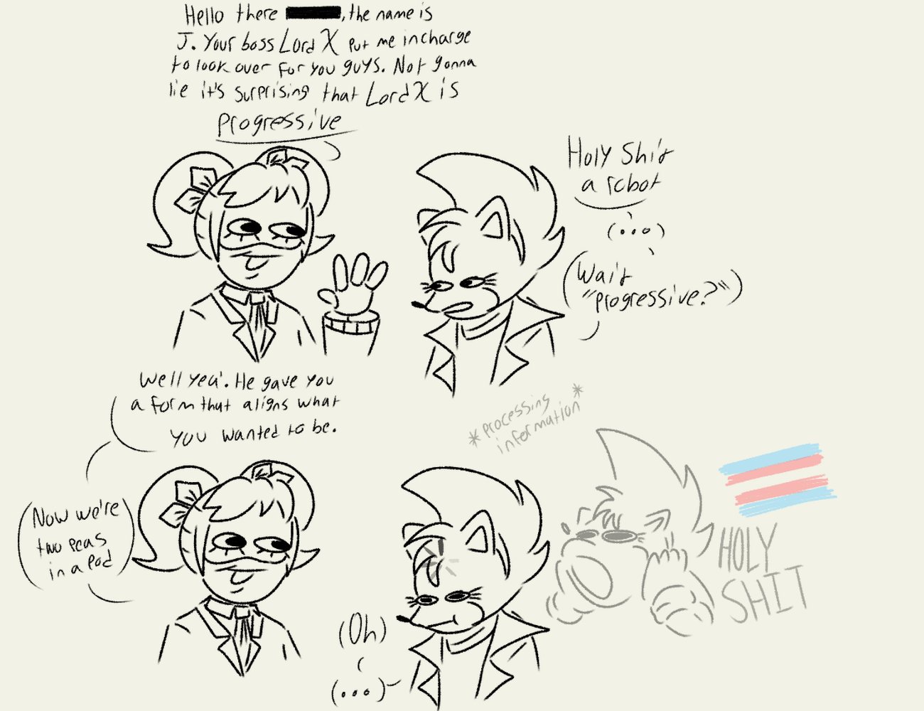 >"So we're partners. But only for now. After we bust those rogue vessels, it's payback time for kidnapping Kylie.">"Eh? Jeez, one little mistake! I said I'm sorry!">"Yeah, whatever. Now, the impostor was a shape shifter, so that means it was either Rewrite or NMI.">"Hey, NMI was my idea! I thought of that!">"Think of this, Einstein, who would want to steal 2017's technology?">"Ooh, ooh, I know, I know! Zetsubo...">"Zetsubo? Get serious, will ya?">"The...mighty Duke!">"Are you out of your mind? ...Don't answer that.">"Curse!">"Forget it X, I need Gekido's help on this. We're going to the meat processing plant."