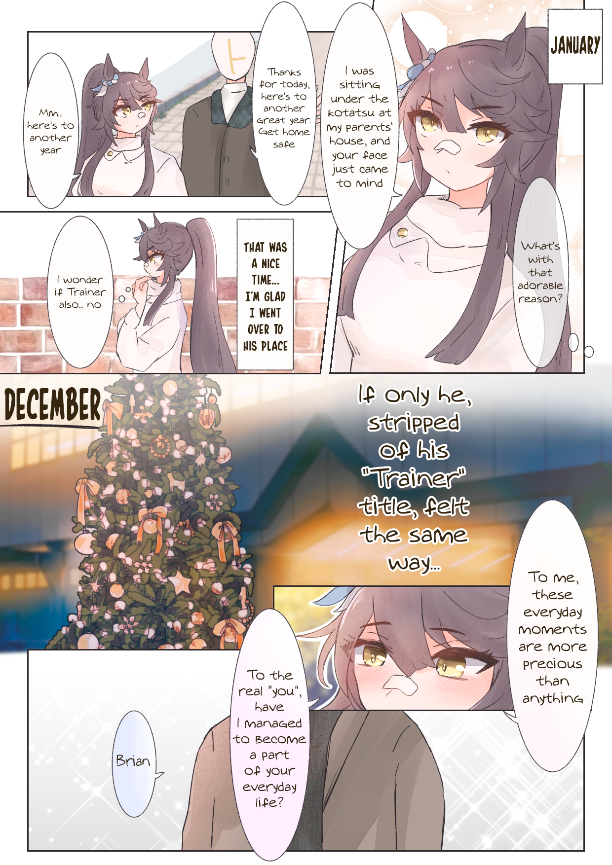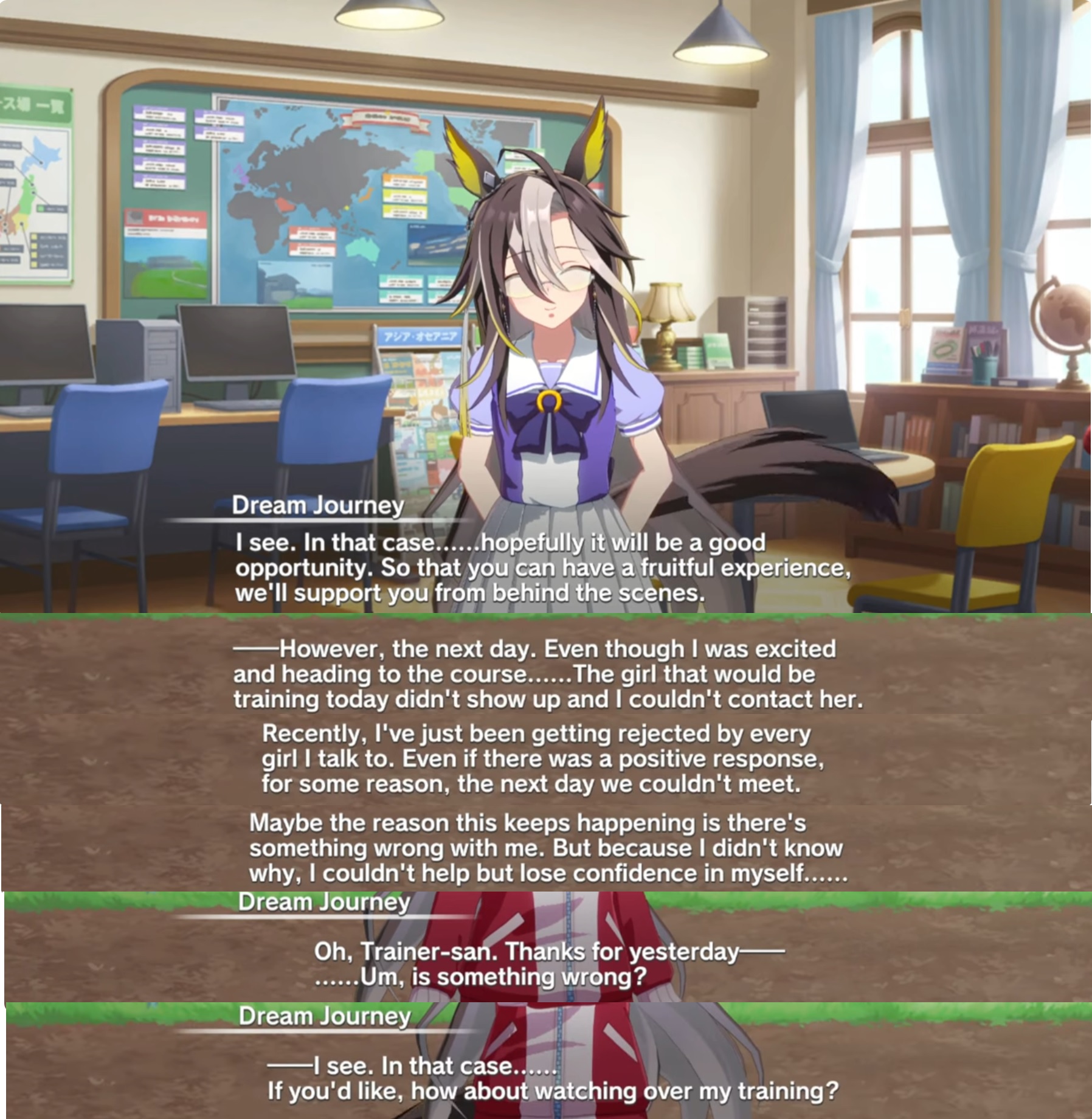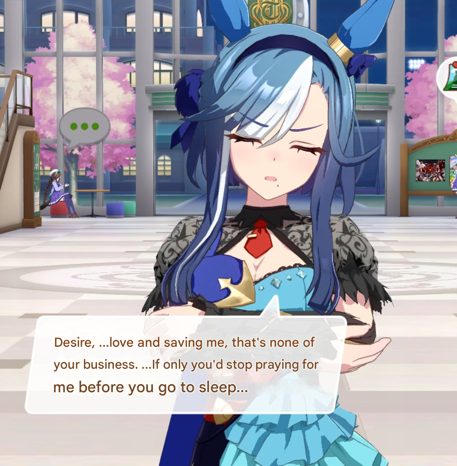 Dream Journey never actually gaslights (You). When (You) ask her if she only chose (You) because she wanted to control you and whatever, she straight up says (You) shouldn't devalue yourself like that and the way she got other umas to back off from partnering up with (You) was simply offering them veteran trainers, which she says is proof that they aren't worthy of (You).And this is the complete truth because the two of you share a backstory where you cheered on for Stego despite her being an underdog, and you gave your seat for her so she could watch the race. Orfevre thinks (You) are a complete loser and Dream defends (You). She genuinely believes your kindness and vision is the only thing that can guide her path, but because (You) are so nice she has to be the darkness under your light.