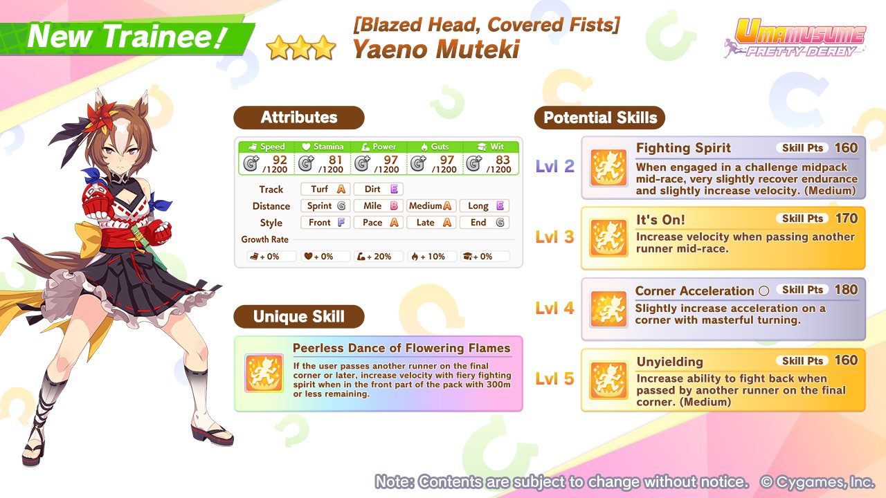 Previous: >>564096416>Global Game NewsLink your account to Cygames iDCurrent Scenario: Make A New Track aka "Trackblazer"Current Rate Up Trainee: Nishino Flower (3*)Current Rate Up Support Cards: SSR Daiwa Scarlet (Power), SR Sweep Tosho (Wit)Current CM: Aries Cup - Nakayama Turf 2000mCurrent Event: Ligne Droite Story Event, Racing Carnival>Schedule04/12 - Nishino Flower (3*), Daiwa Scarlet (SSR), Sweepy (SR)04/20 - Yaeno Muteki (3*), Ines Fujin (SSR), Twin Turbo (SSR)04/20 - Aries Cup - Medium/Right/Spring/Firm/200004/26 - Golshi Week Celebration04/26 - Cheerleader Nice Nature (3*), Cheerleader King Halo (3*), Bamboo Memory (SSR), Seeking the Pearl (SSR)04/26 - Tracen Cheer Squad Story Event04/30 - Ines Fujin (3*), MR. C.B. (SSR), Tokai Teio (SR)https://pages.snep.pw/uma/anni-skill-changes>JP Game NewsCurrent Rate Up: Lucky Lilac (3*), SSR Aston Machan, SR Hishi AmazonNew Scenario "Beyond Dreams" releasedTimeline: https://uma.moe/timelineCygames Webstore: https://webstore.cygames.com/en/umamusume_en>Thread Clubshttps://rentry.co/umaglobalclublistYou must be E3 (20k points) to join a circle. Apply with /uma/ or /vg/ in your profile or post ID in the thread.>All Guides & Resourceshttps://rentry.org/uma26Game databasehttps://gametora.com/umamusume (Click the gear to switch between JP / global server info)A basic guide for newfagshttps://rentry.org/umaglobalFind networks if your region is blocked from the game or clienthttps://www.umavpn.topSeiyuu & Concertshttps://rentry.org/umstUmamusume Birthday Calendarhttps://ウマ娘.攻略.tools/events/birthdayUma Texthttps://umareader.idsmile.xyzCustom Stickershttps://schizo.farm/resources/stickers