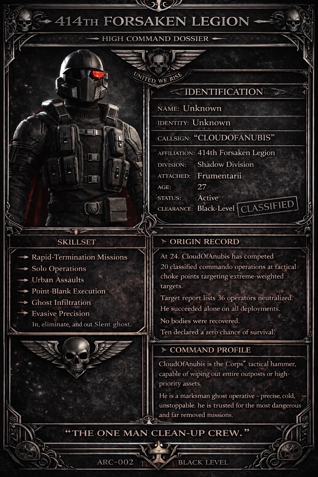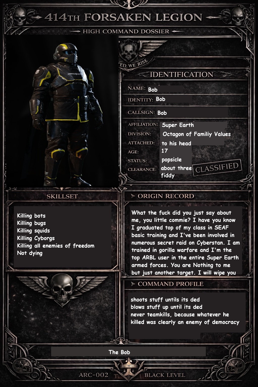 >>564148591>414th FORESKIN LEGION>MY NAME: UNKNOWN>DIVISION: SHADOW>ATTACHMENT: FUTANARI>STATUS: VIRGIN>CLEARANCE: BLACKED>ORIGIN: THIS COMMANDO IS EXTREMELY-OVERWEIGHTI can't be assed to finish this