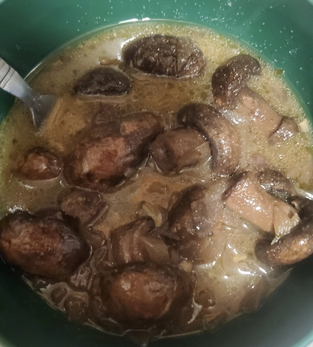 Fish and mushrooms in a hearty butter, oil and wine broth