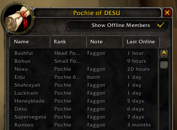 >>564167801><Thousand Tusks> - Epoch, Kezan realm (PvE), Crossfaction><DESU> - Epoch, Gurubashi realm (PvP)So which one are we migrating to, Turtlebro's?