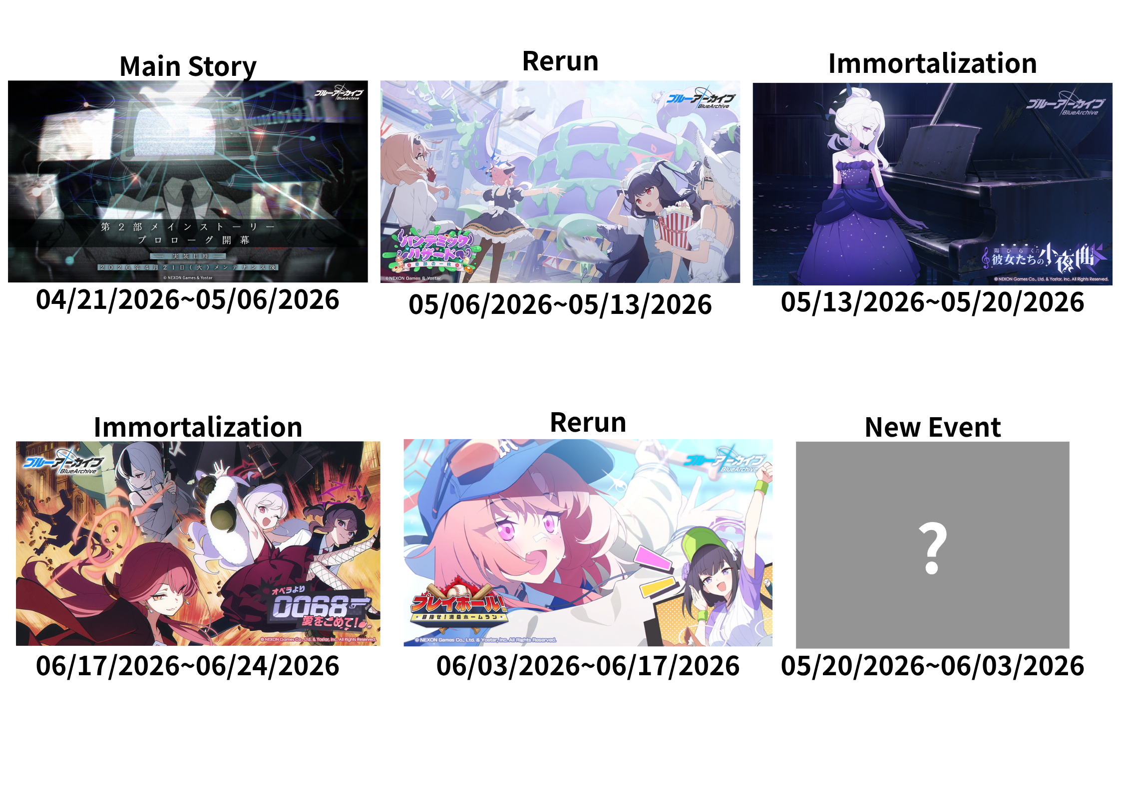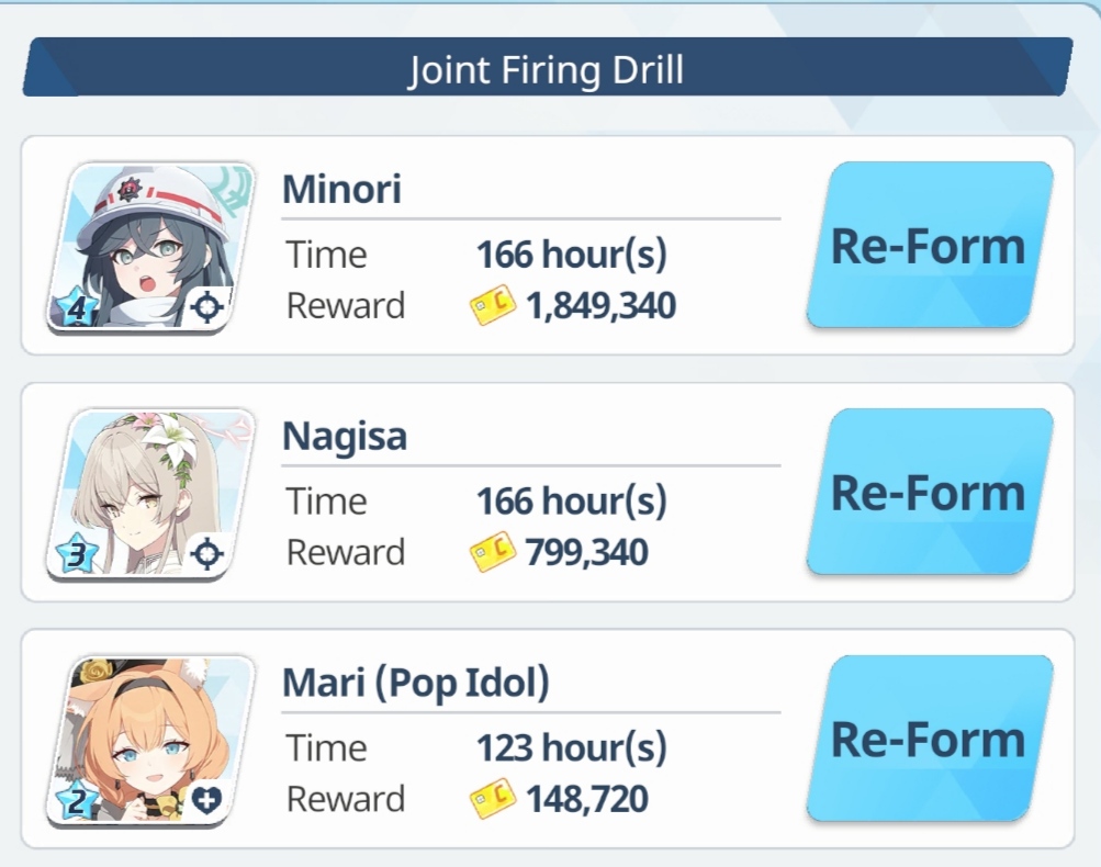 Previous Thread: >>564155897>Guides, Resources and useful links:https://rentry.org/bagguides>/bag/Circles/Clubs/Friends:https://rentry.org/holdingthebag>4koma, Manga, Side Content, PVs & Shortshttps://rentry.org/bacontent>>(JP) – JST>Banners:>4/21 After Maint – 5/6 10:59Niko (Limited)Kurumi (Limited)Otogi (Welfare)>News:Livestream Summary: https://rentry.org/4chanBagStream0419Patch notes: https://bluearchive.jp/news/newsJump/651>Events:Special Operation: Lore Pursuit – 4/21 After Maint – 5/6 10:59>Content:Total Assault: Kaiten (Urban) – 4/29 11:00 – 5/6 3:59Joint Firing Drill (Defense) – 5/6 11:00 – 5/13 3:59Limit Break Assault: Chokmah (Outdoor – w/Heavy Armor) – 4/22 11:00 – 5/27 3:592x Lesson/Scrimmage – 4/21 4:00 – 4/29 3:592x Account EXP – 4/25 4:00 – 4/27 3:592x Normal – 4/29 4:00 – 5/6 3:592x Account EXP – 5/2 4:00 – 5/7 3:592x Bounty – 5/6 4:00 – 5/13 3:592x Commissions – 5/13 4:00 – 5/20 3:592x Hard – 5/20 4:00 – 5/27 3:59>>(GLOBAL) – UTC>Banners:>4/21 After Maint – 4/28 1:59Mari (Pop Idol – Limited)Sakurako (Pop Idol – Limited)Mine (Pop Idol – Welfare)KahoKazusa>News:Patch notes: https://forum.nexon.com/bluearchive-en/board_view?thread=3425677>Events:Serenade Promenade – 4/21 After Maint – 4/28 1:59Balancing Schale's Books with the General Student Council – 4/21 After Maint – 4/28 1:59My Office: https://bluearchive.nexon.com/user/myoffice>Content:Grand Assault: Kaiten (Urban – Torment w/Heavy & Light Armor) – 4/21 2:00 – 4/27 18:59Limit Break Assault: Chokmah (Field – w/Heavy Armor) – 4/8 2:00 – 4/27 18:592x Lesson/Scrimmage – 4/20 19:00 – 4/27 18:592x Bounty – 4/27 19:00 – 5/4 18:592x Account EXP – 5/1 19:00 – 5/3 18:592x Normal/Lesson – 5/4 19:00 – 5/11 18:592x Account EXP – 5/8 19:00 – 5/10 18:59
