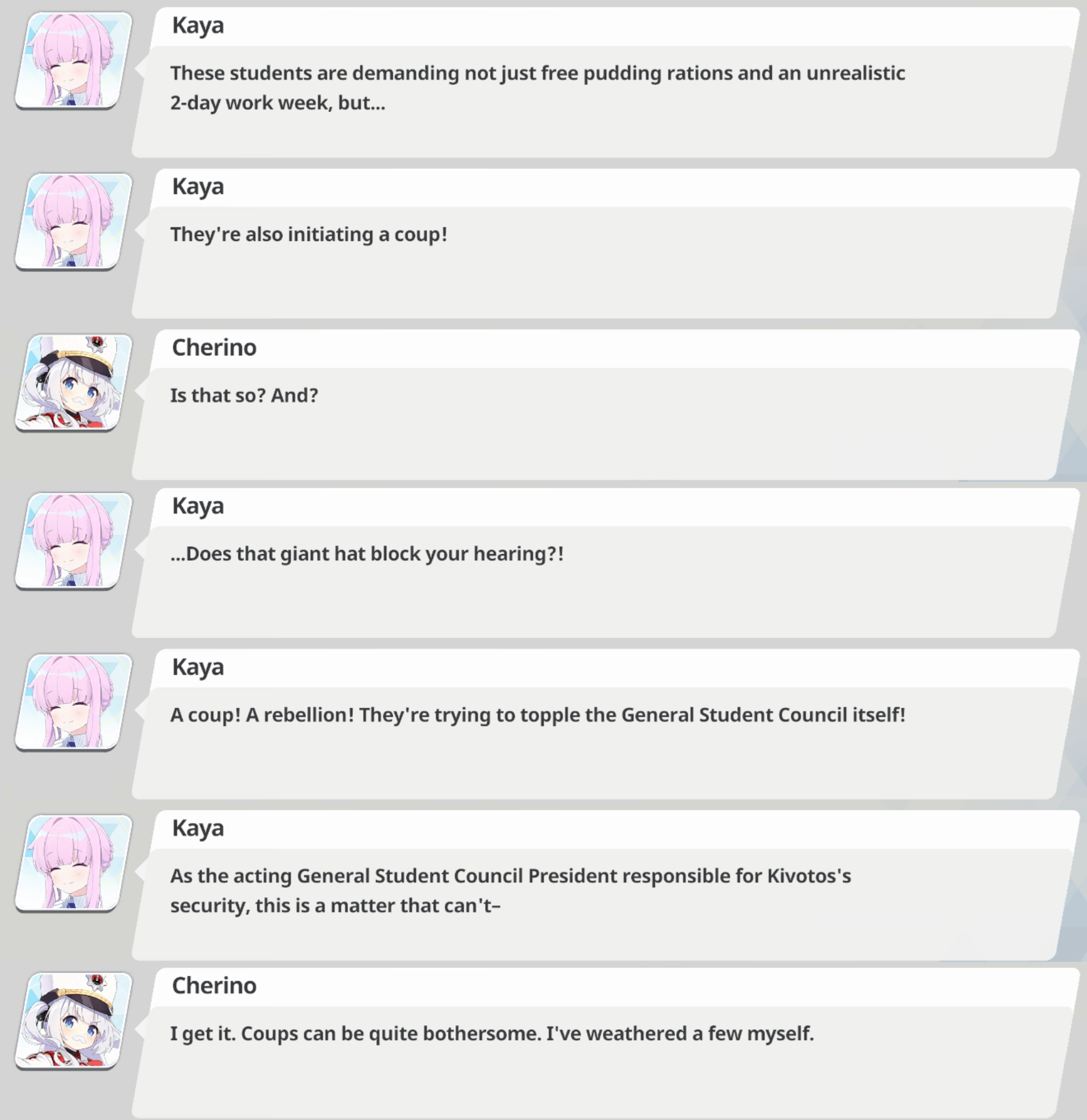 >GSC President: Are you sure of your decision, Sensei of Schale? Do you understand that undoing this reality will only bring suffering and misery to everyone?>Sensei: I must do the right thing to preserve Kivotos' Proper History!