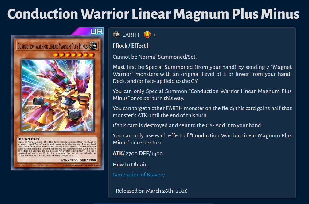 #1185: Yugi Boomer editionPrevious:>>564018267Yu-Gi-Oh! Master Duel is an online multiplayer videogame using the Master Rule Format.>Offline Modhttps://github.com/pixeltris/YgoMaster>Other Modshttps://www.nexusmods.com/yugiohmasterduel/mods/>Current PacksSelection:Challenger's Selection (Staples)The Frenzied Tuning (Kewl Tune, Rose, R.B.)Generation of Bravery (Masked Hero, Magnet Warrior, Illusion Gate)The Drastic Storm (DoomZ, Radiant Typhoon, /Assault, Gouki)Secret:Transmigration Reactor (Materiactor, Full Armored, Rank 3)Transfigured Heroes (AA M Hero Dark Law, Mask Change)Shrouded Heroes (AA D Hero Plasma)Darkest Magics (AA Dark Magician, Secrets of Dark Magic, Dark Magical Circle)>Current EventsDuel Triangle Fusion/Synchro/Link Apr 15th - Apr 27th1500 Days since Launch Campaign until Apr 23rd>BundlesKewl Tune Collection - 2000 GemsDestiny HERO Collection - 2000 Gems4th Anni: Dark Magician Collection - 1800 GemsUseful resources for info on Decklists, Events, etc.>YGOPro Deckhttps://ygoprodeck.com/category/master-duel-decks/>Road of the Kinghttps://roadoftheking.com/>Appmedia (only in Jap)https://appmedia.jp/master_duel>List of Secret Packshttps://yugipedia.com/wiki/Secret_Pack>Official Master Duel Pagehttps://www.konami.com/yugioh/masterduel/en/>Yu-Gi-Oh! Probability Calculatorhttps://yugioh.otterlord.dev>Small World Helphttps://small-world.yugioh-api.com/resolve>New Player Guidehttps://files.catbox.moe/95jg6n.jpg>Master Duel Metahttps://www.masterduelmeta.com/